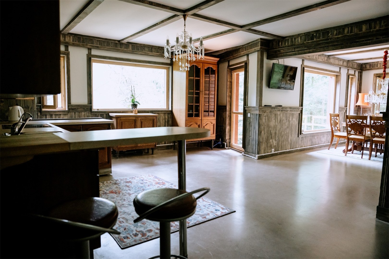 В номере: вешалка, диван, зеркало, комод, кресло, кровать двуспальная, кухонная мебель, стол, столик кофейный, стулья, шкаф, набор посуды, стиральная машина, телевизор ЖК, холодильник