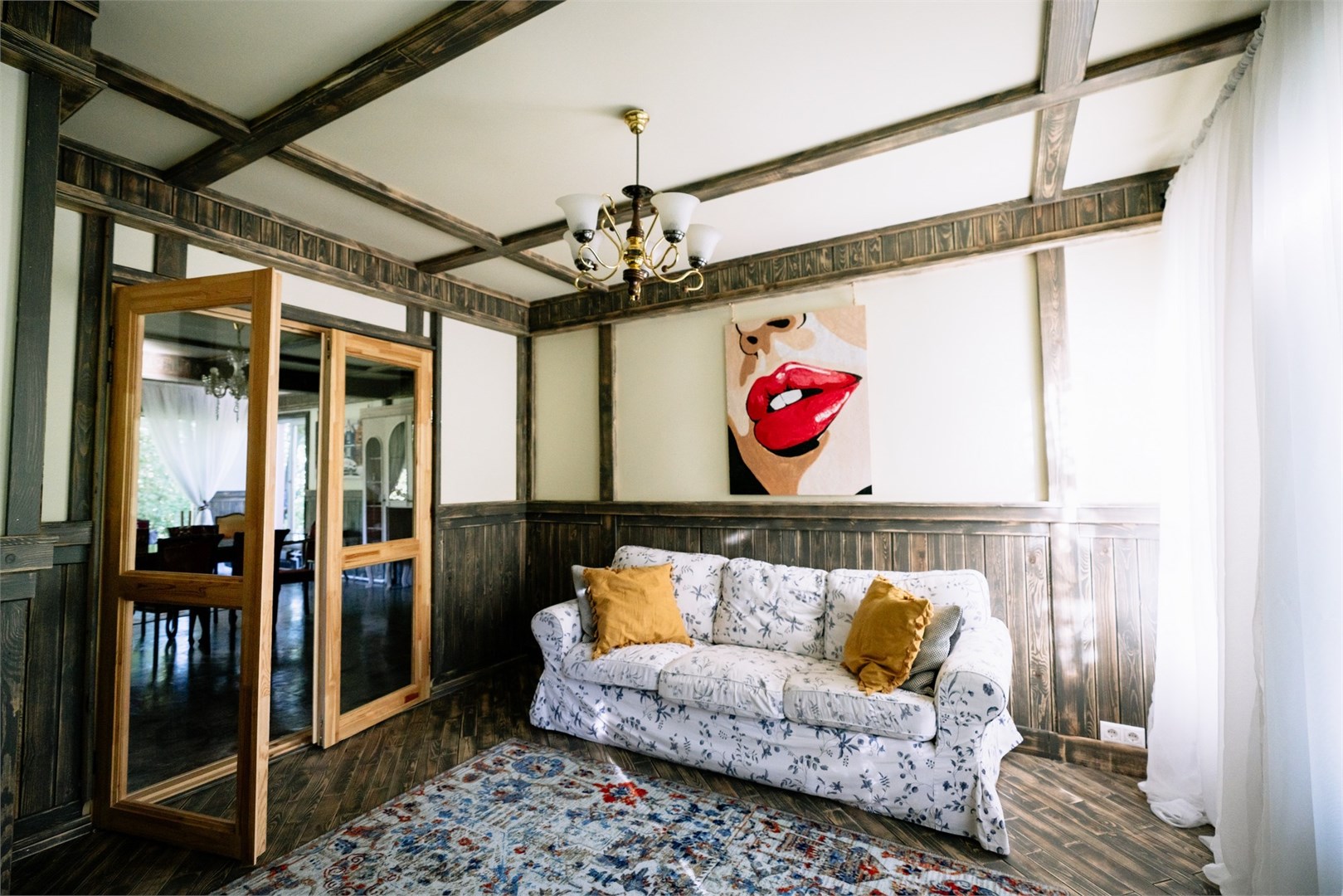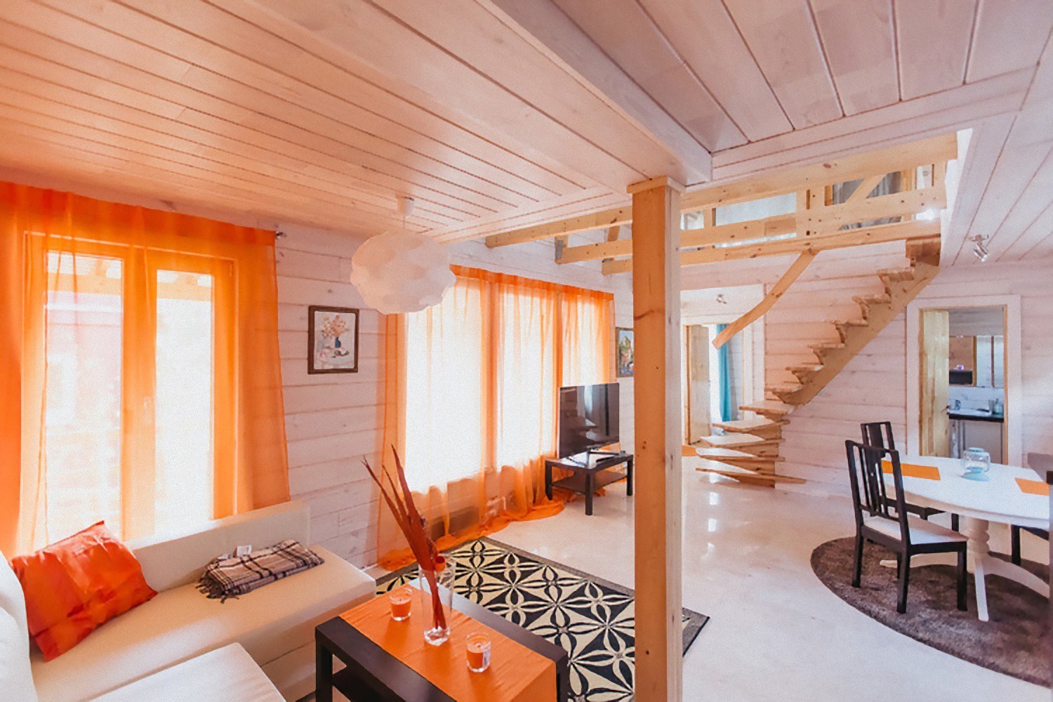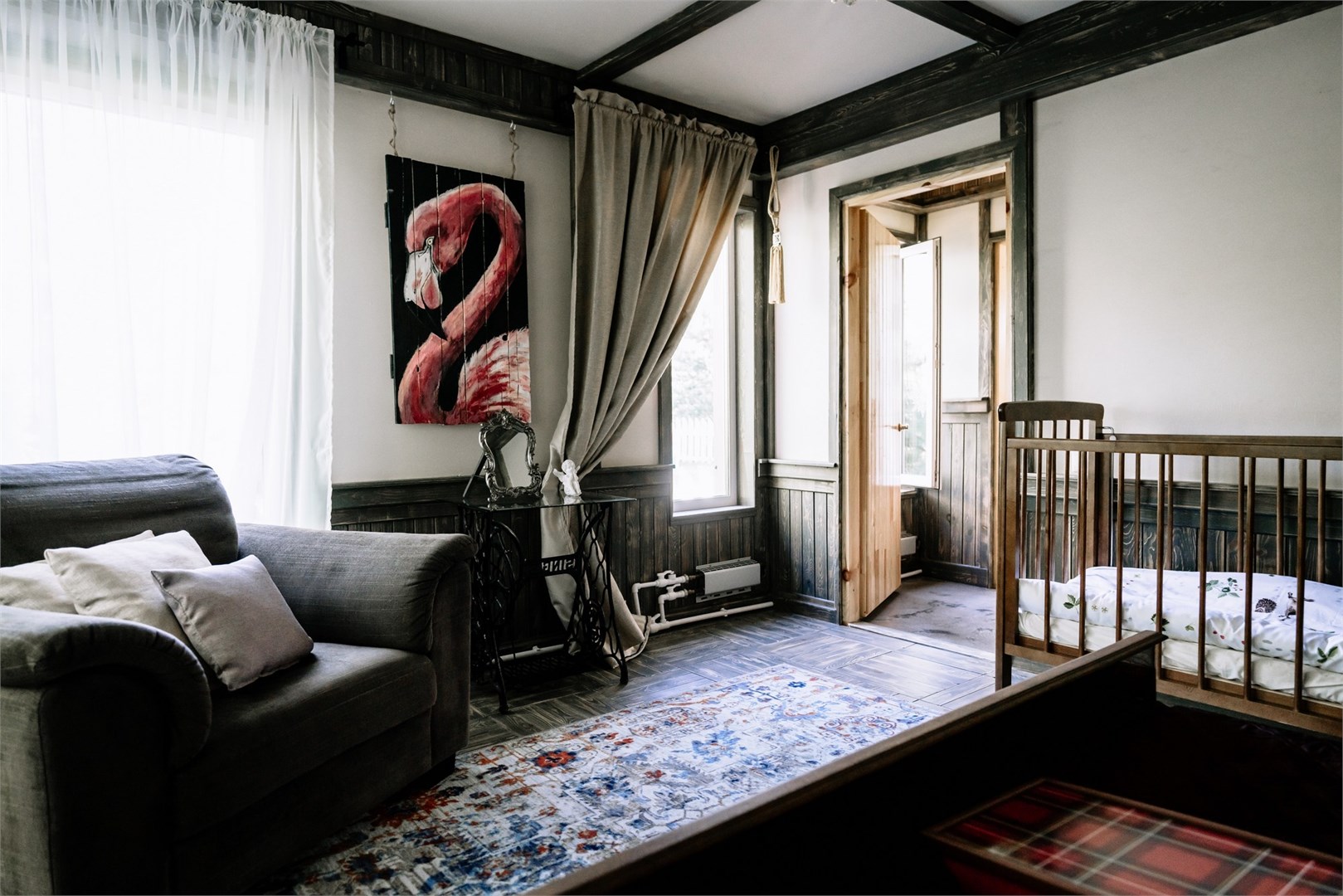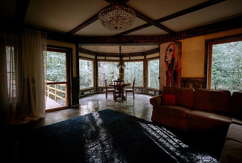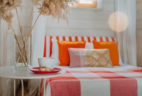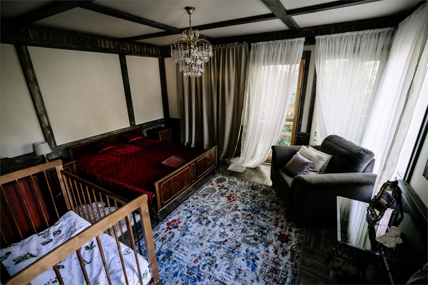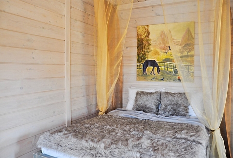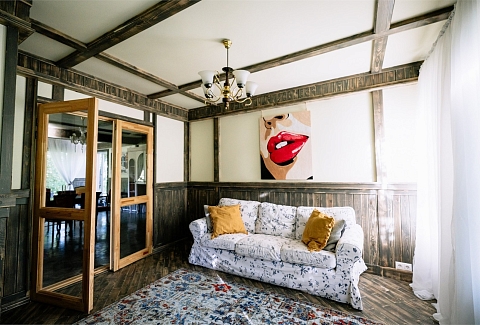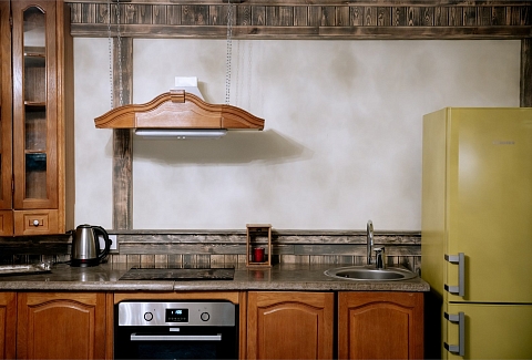 В номере: вешалка, диван, зеркало, кровать двуспальная, кровать детская, кровать односпальная, кухонная мебель, прикроватные тумбочки, шкаф, духовой шкаф, набор посуды, плита электрическая, телевизор ЖК, холодильник