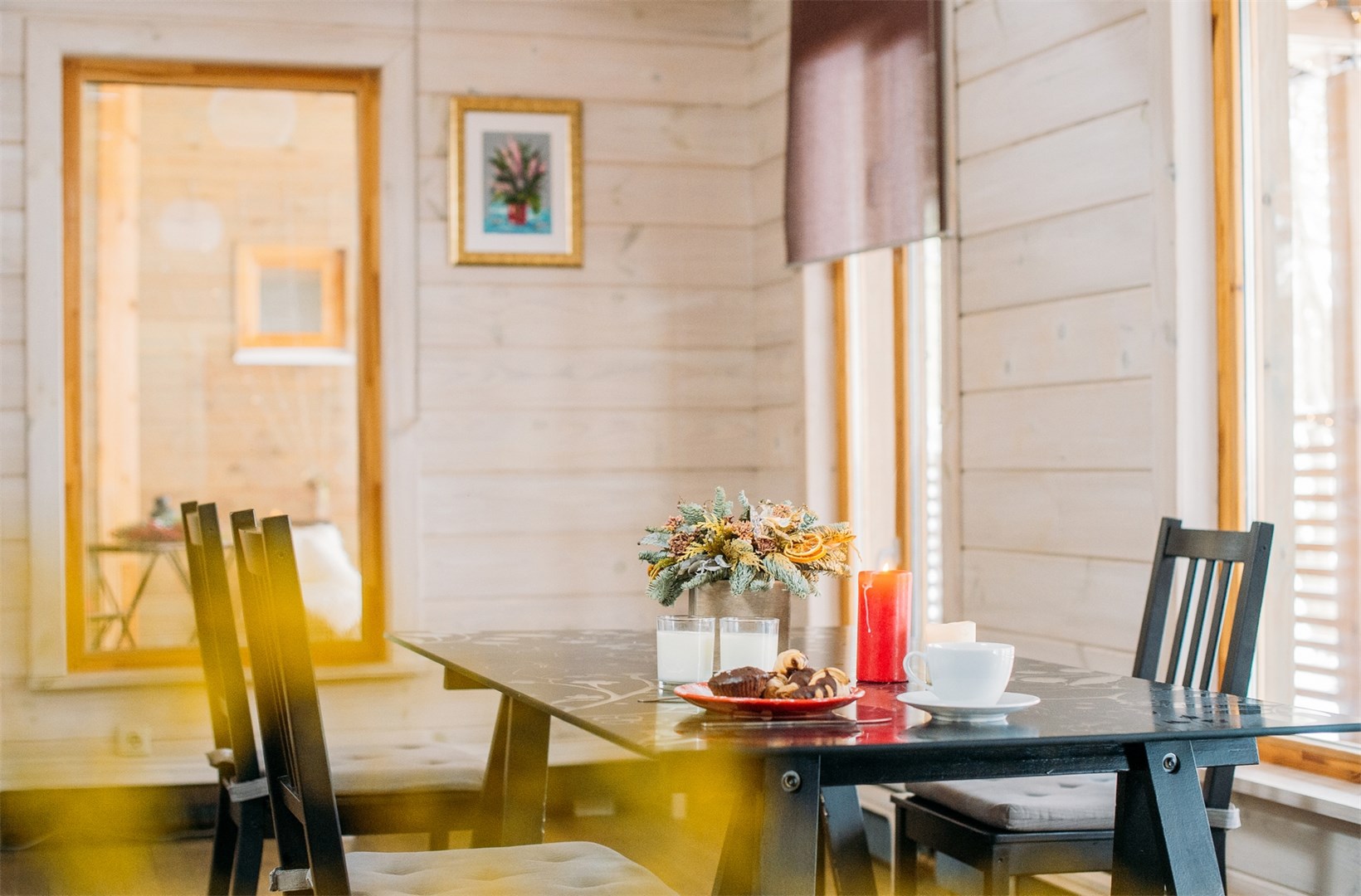 В номере: вешалка, гардеробная, зеркало, кровать двуспальная, кровать полутороспальная, кухонная мебель, прикроватные тумбочки, стол обеденный, стулья, шкаф, духовой шкаф, набор посуды, плита электрическая, телевизор ЖК, холодильник, чайный набор посуды, электрочайник
