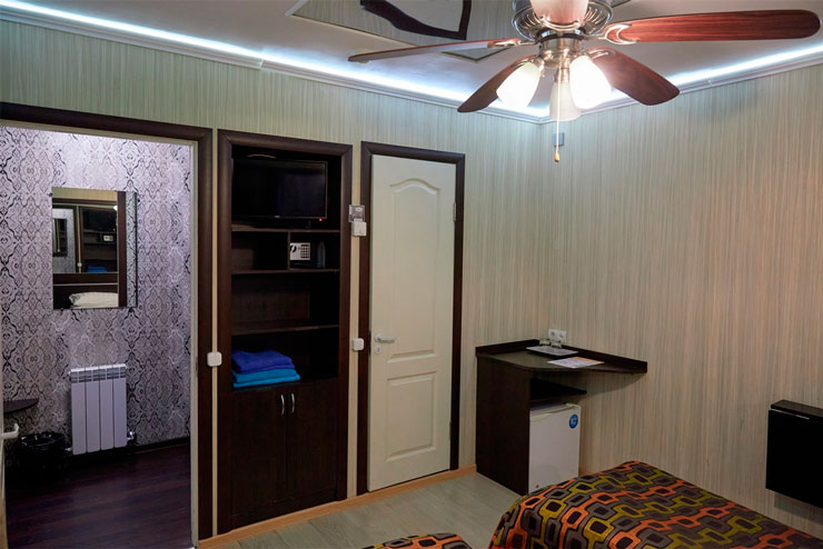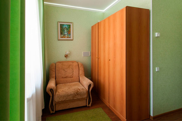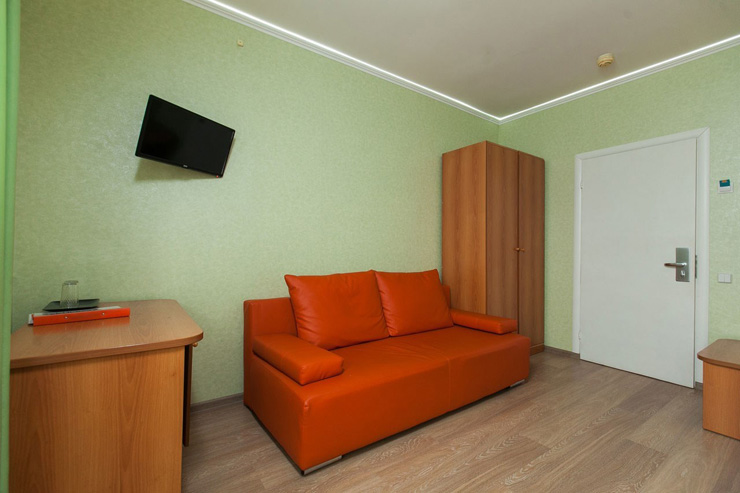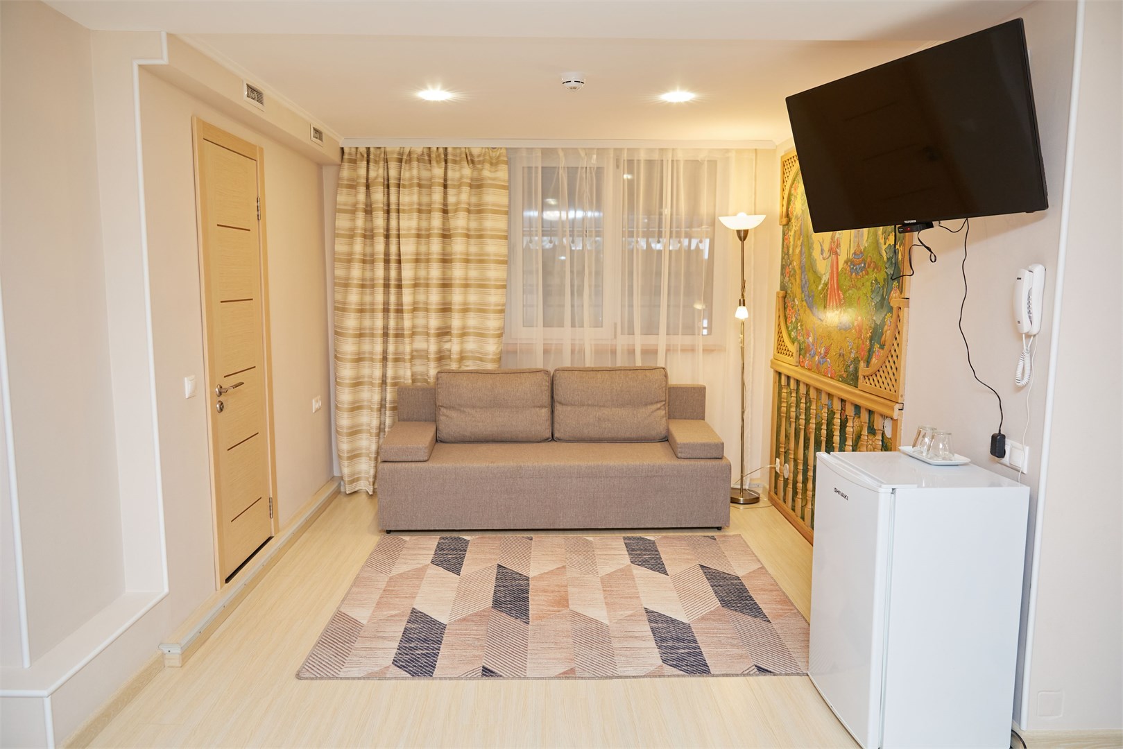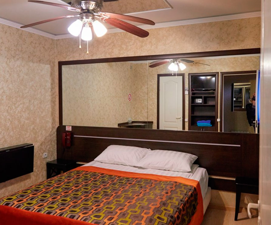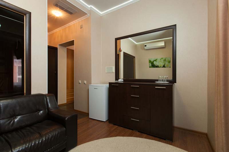 В номере: диван раскладной, зеркало, кровать двуспальная, прикроватные тумбочки, стол, стулья, шкаф, мини-холодильник, сейф, телевизор, телефон, холодильник