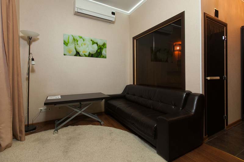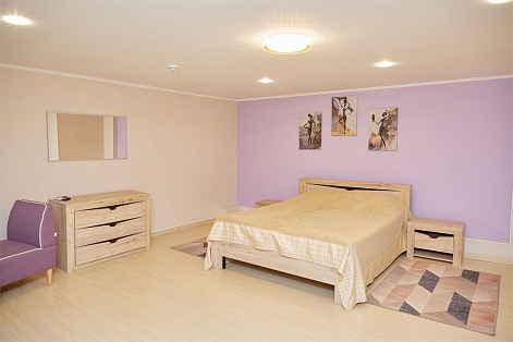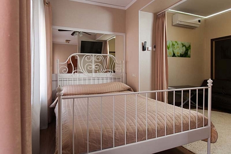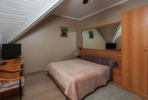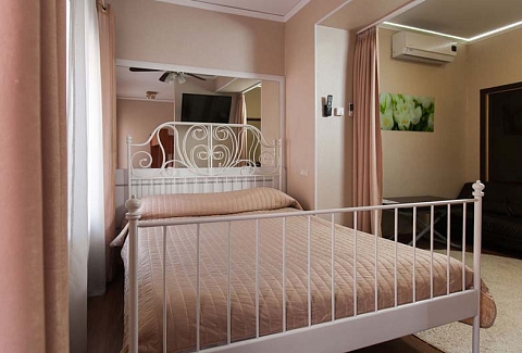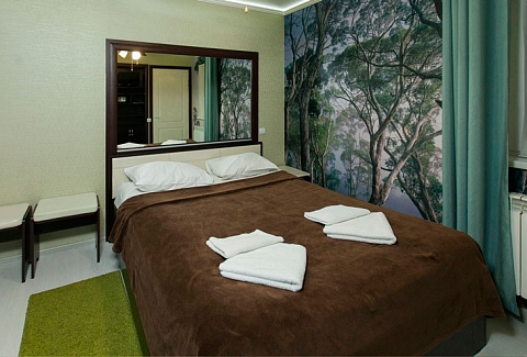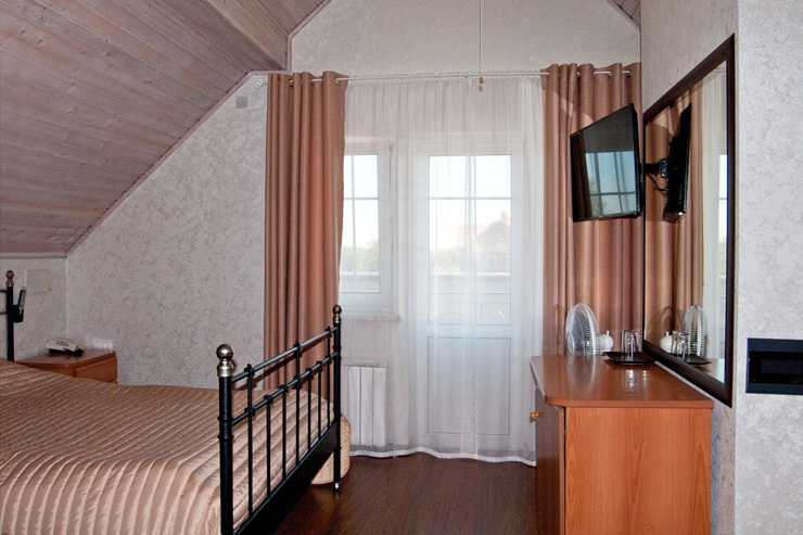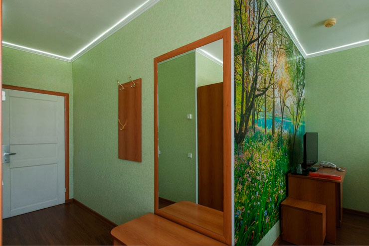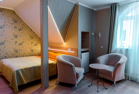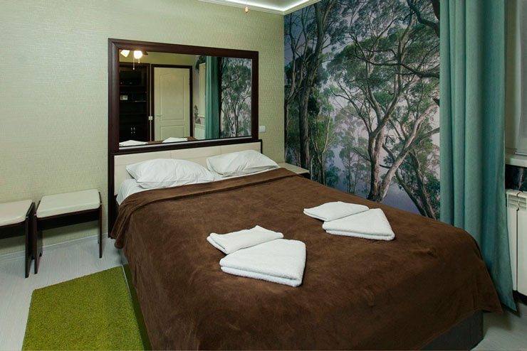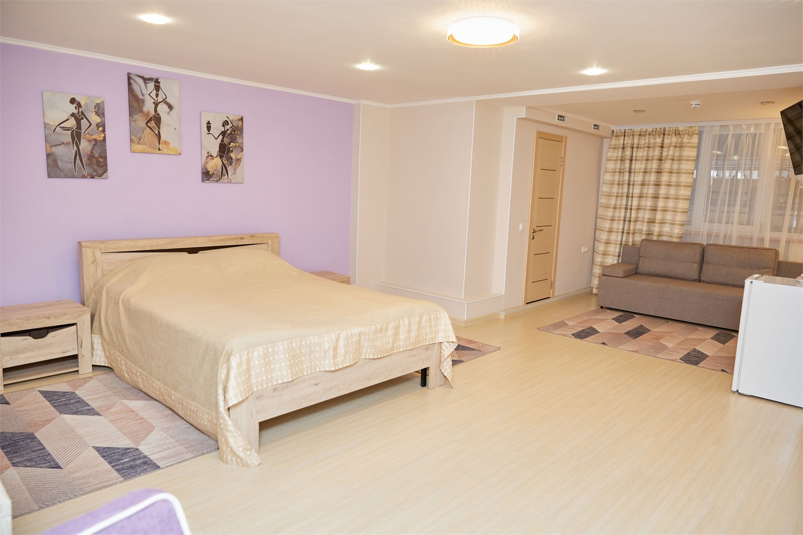 В номере: диван раскладной, зеркало, кровать двуспальная, прикроватные тумбочки, стол, стулья, шкаф, мини-холодильник, сейф, телевизор, телефон, холодильник