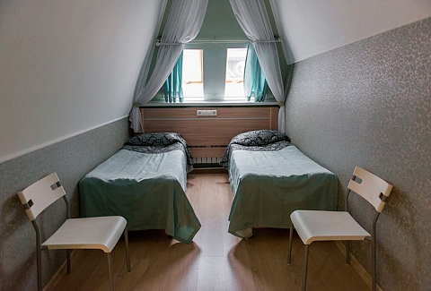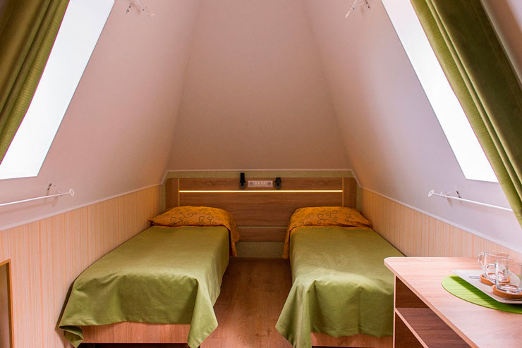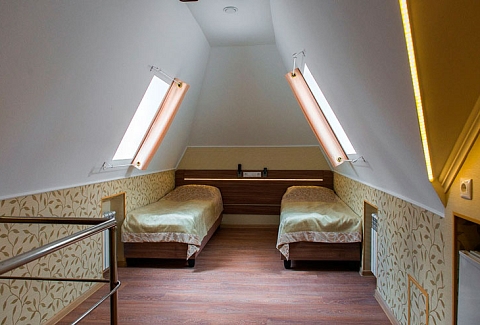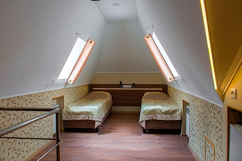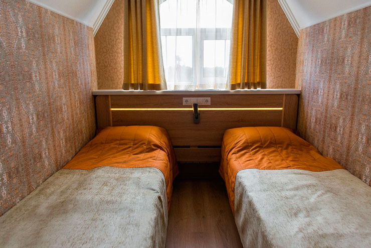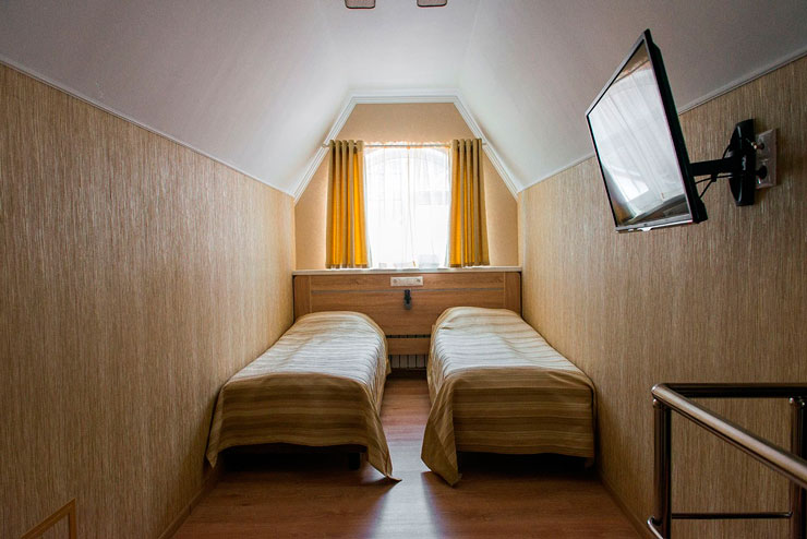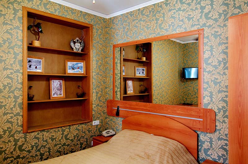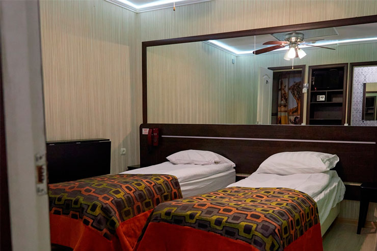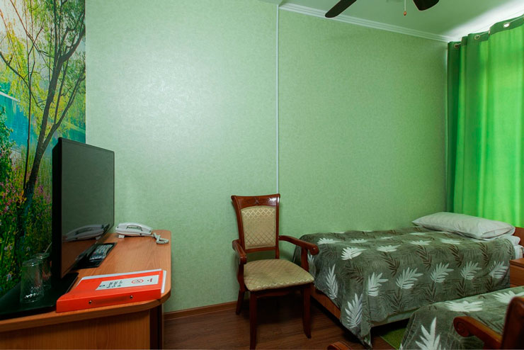 В номере: диван, зеркало, кровати односпальные, прикроватные тумбочки, стол, стулья, шкаф, мини-холодильник, сейф, телевизор, телефон