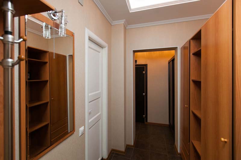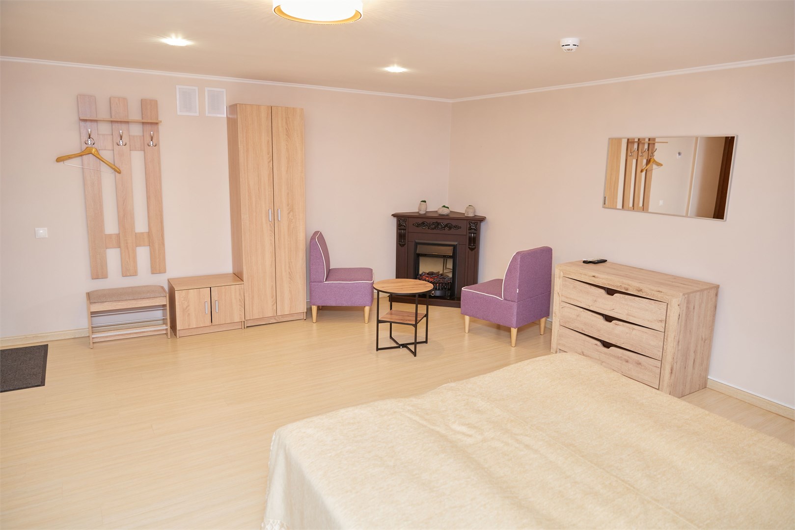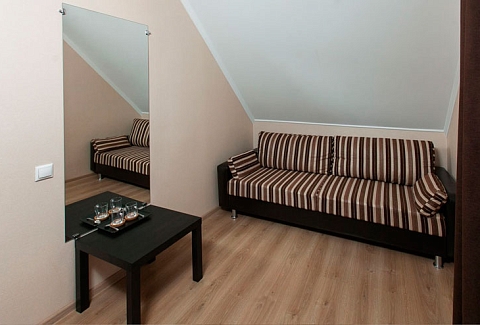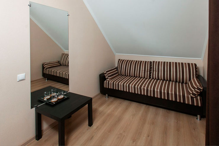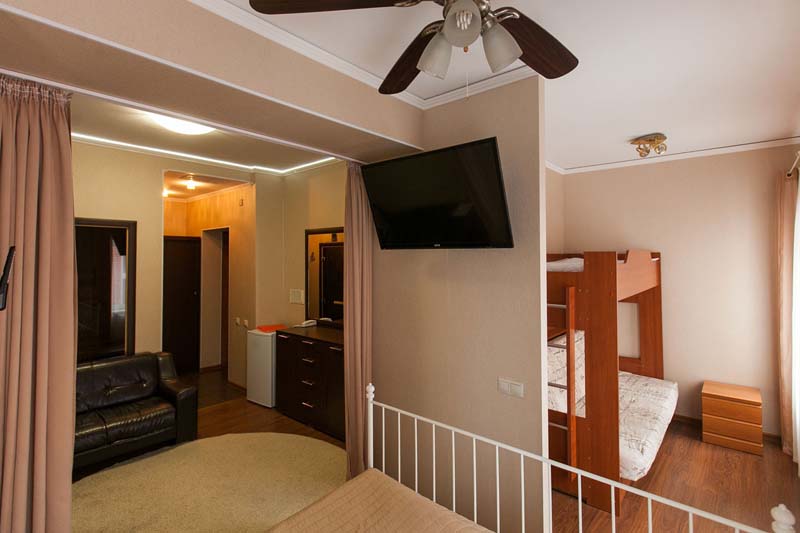В номере: диван, зеркало, комод, кровать двуспальная, кровать двухъярусная, прикроватные тумбочки, стол, столик кофейный, стулья, шкаф, мини-холодильник, сейф, телевизор, телефон
