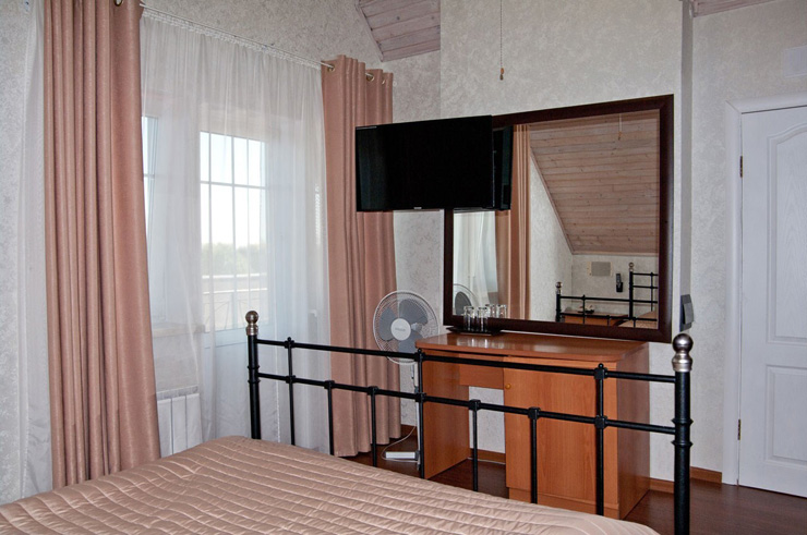 В номере: вешалка, зеркало, кровать двуспальная, прикроватные тумбочки, стол, стулья, шкаф, мини-холодильник, сейф, телевизор, телефон