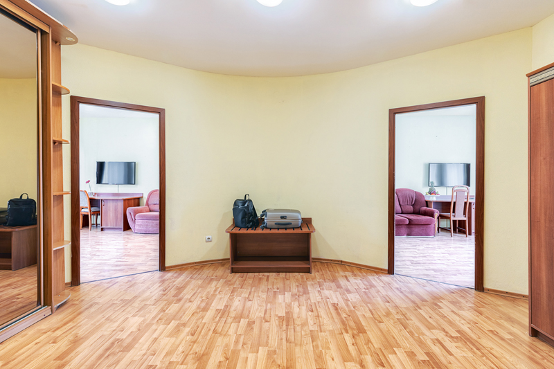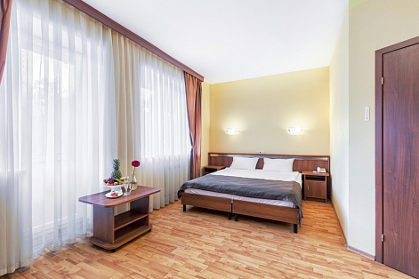 В номере: диван, зеркало, кровать двуспальная, прикроватные тумбочки, стол, стулья, шкаф, кондиционер, мини-холодильник, телевизор, телефон