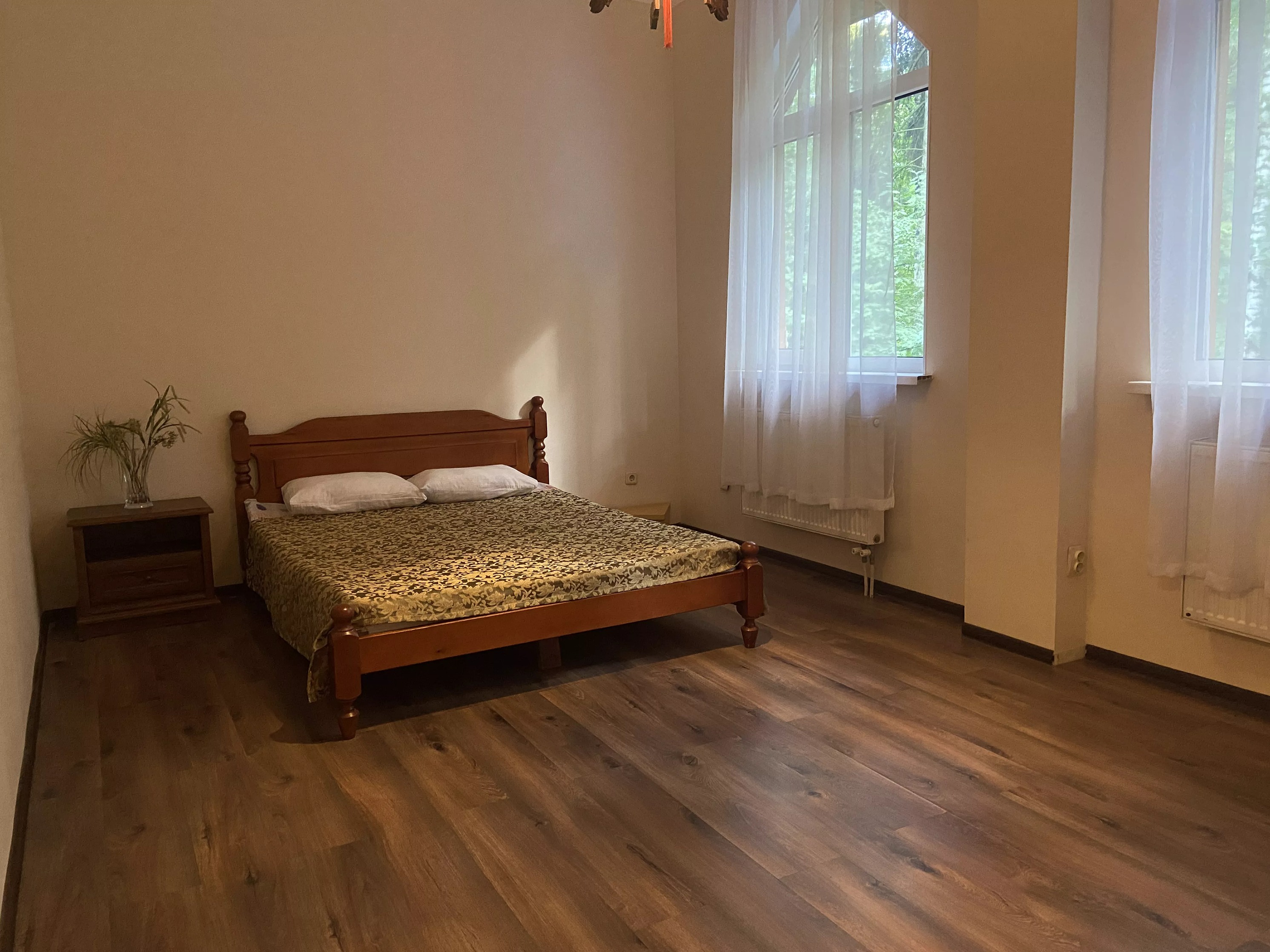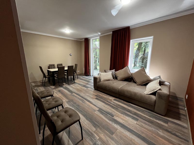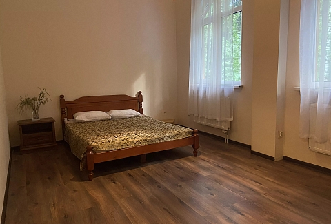 В номере: вешалка, гардеробная, диван, зеркало, комод, кровать двуспальная, кухонная мебель, прикроватные тумбочки, стол, стулья, шкаф, микроволновая печь, набор посуды, плита электрическая, телевизор, холодильник, электрочайник