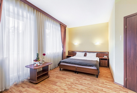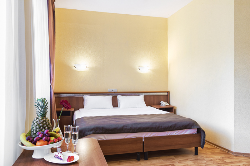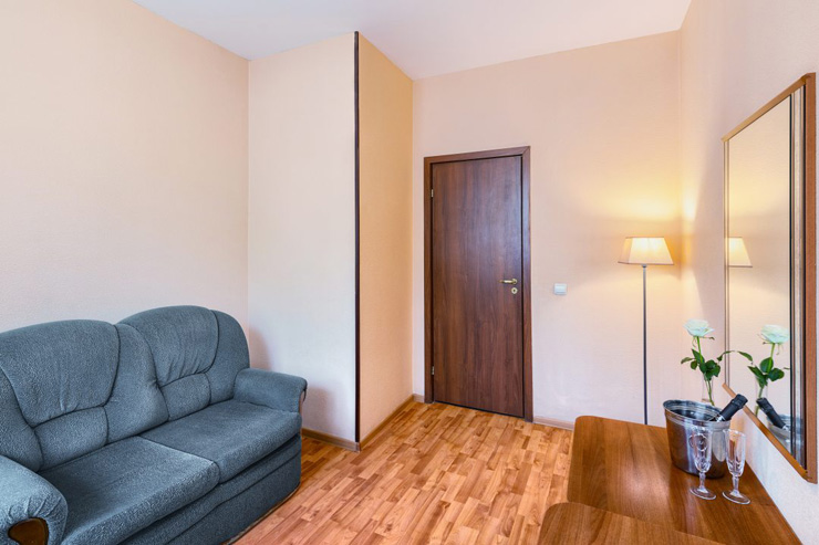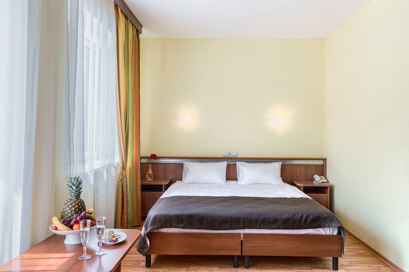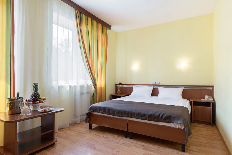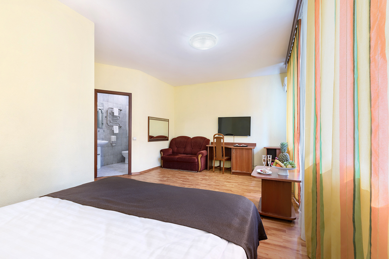 В номере: диван, зеркало, кровать двуспальная, прикроватные тумбочки, стол, стул, шкаф, кондиционер, мини-холодильник, телевизор, телефон
