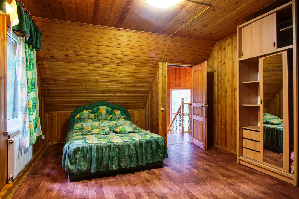 В номере: вешалка, гардеробная, диван, зеркало, комод, кровать двуспальная, кухонная мебель, прикроватные тумбочки, стол, стулья, шкаф, камин, микроволновая печь, набор посуды, плита электрическая, телевизор, холодильник, электрочайник