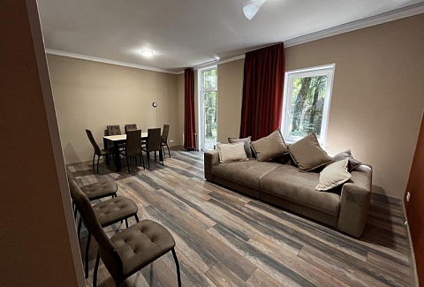 В номере: вешалка, гардеробная, диван раскладной, зеркало, комод, кресла, кровати полутороспальные, кровать двуспальная, кухонная мебель, набор мягкой мебели, прикроватные тумбочки, стол, стулья, шкаф, микроволновая печь, набор посуды, телевизор, холодильник, электрочайник