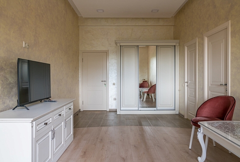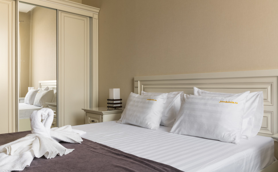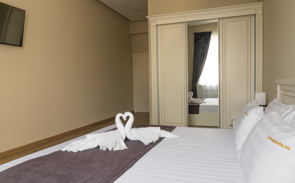 В номере: диван, зеркало, качели подвесные, кровать двуспальная, прикроватные тумбочки, стол, стулья, шкаф, кондиционер, телевизор ЖК, холодильник, электрочайник