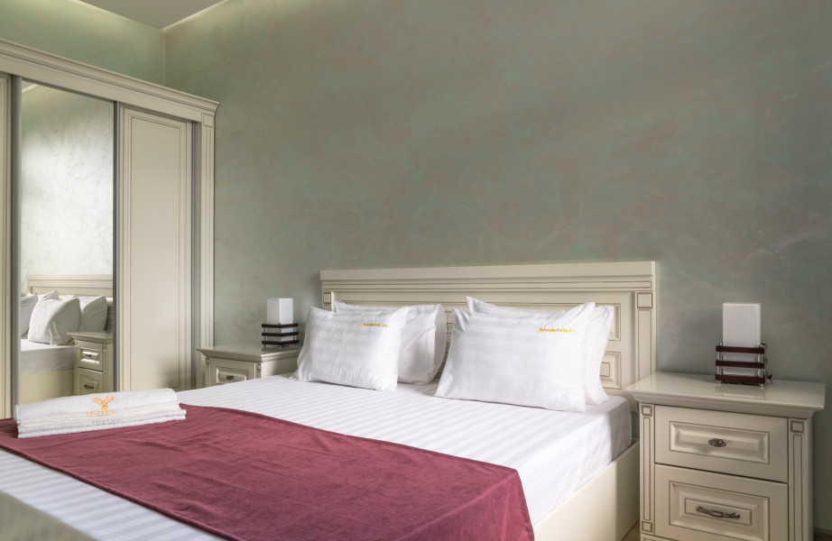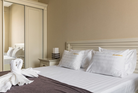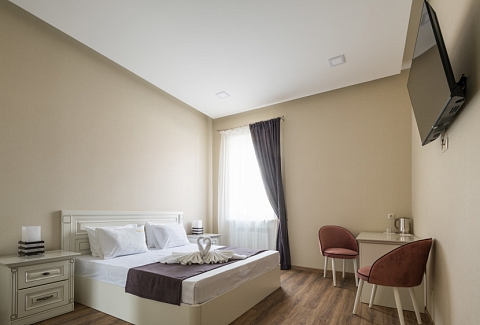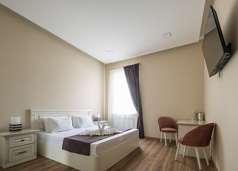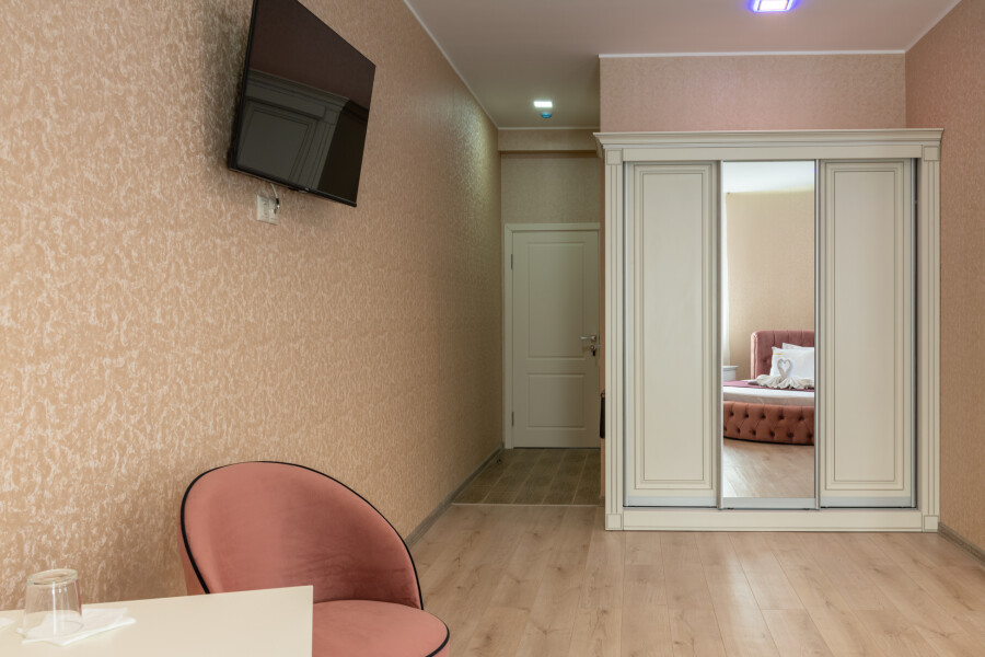 В номере: зеркало, кровать двуспальная, прикроватные тумбочки, стол, стулья, шкаф, телевизор ЖК, холодильник, электрочайник