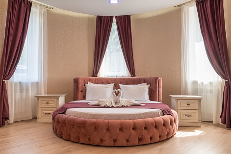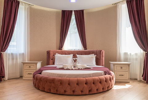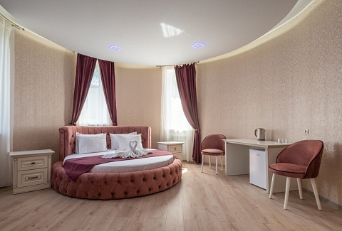 В номере: зеркало, кровать круглая, прикроватные тумбочки, стол, стулья, шкаф, кондиционер, телевизор ЖК, холодильник, электрочайник