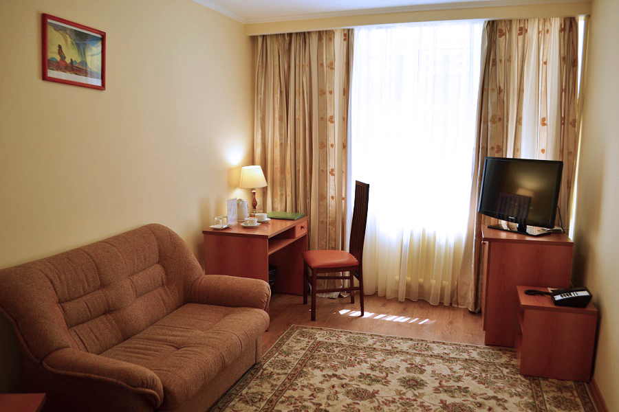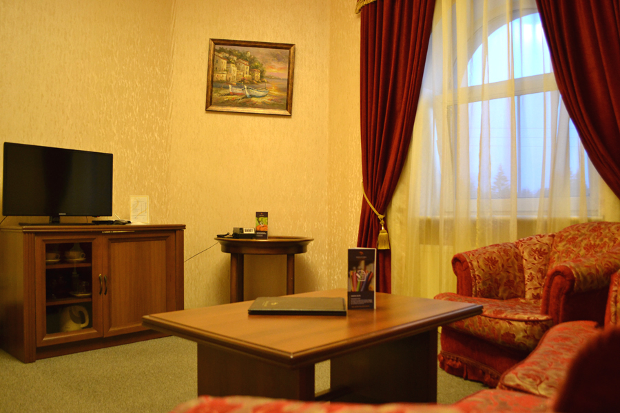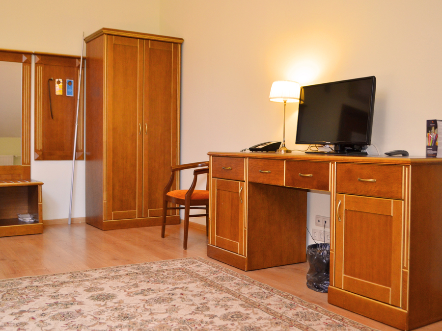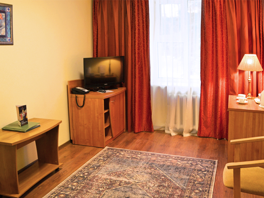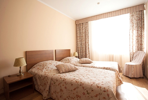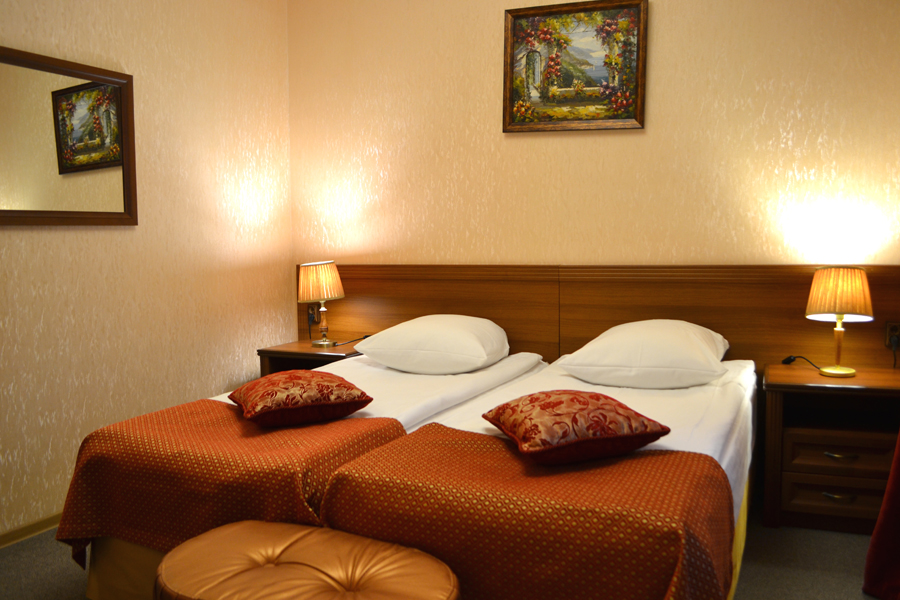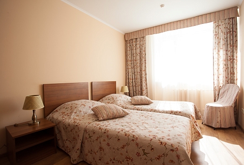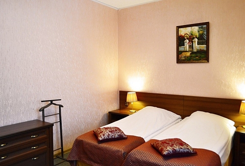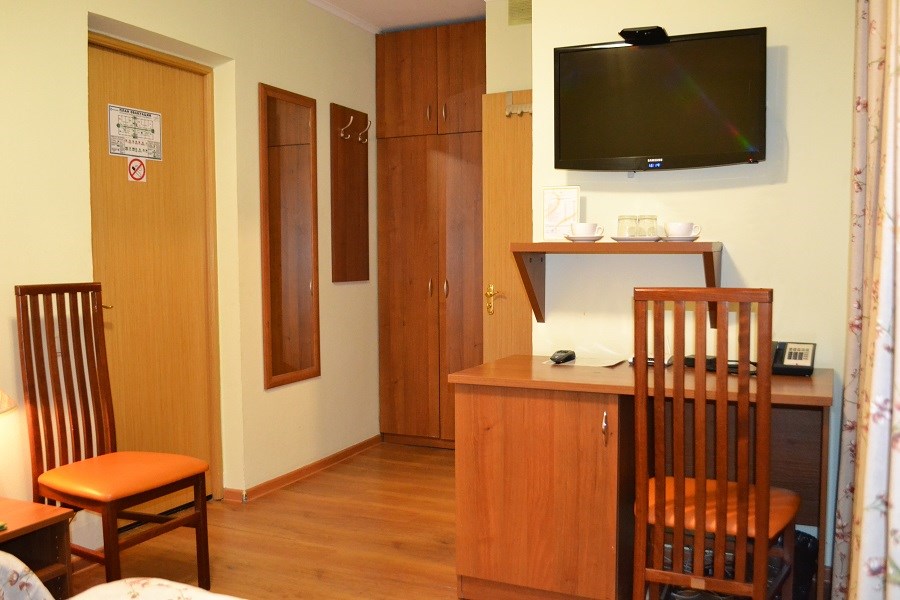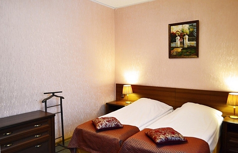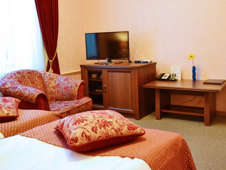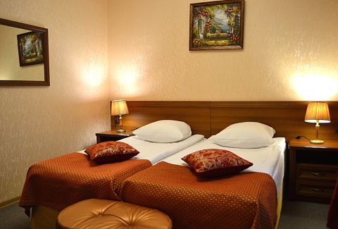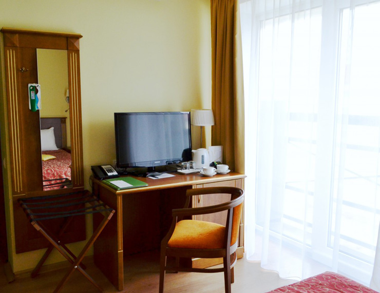 В номере: вешалка, зеркало, кровати односпальные /одна двуспальная кровать, прикроватные тумбочки, стол, столик журнальный, стулья, шкаф, мини-холодильник, набор посуды, телевизор, телефон