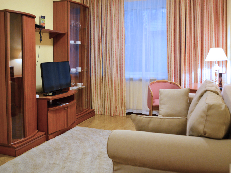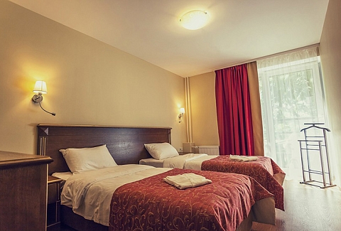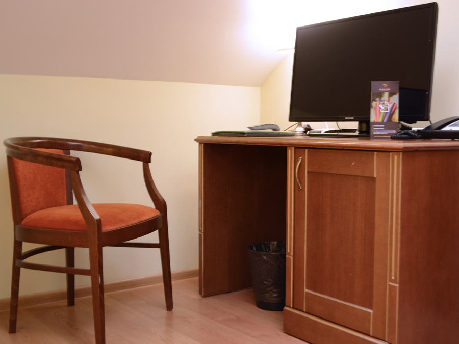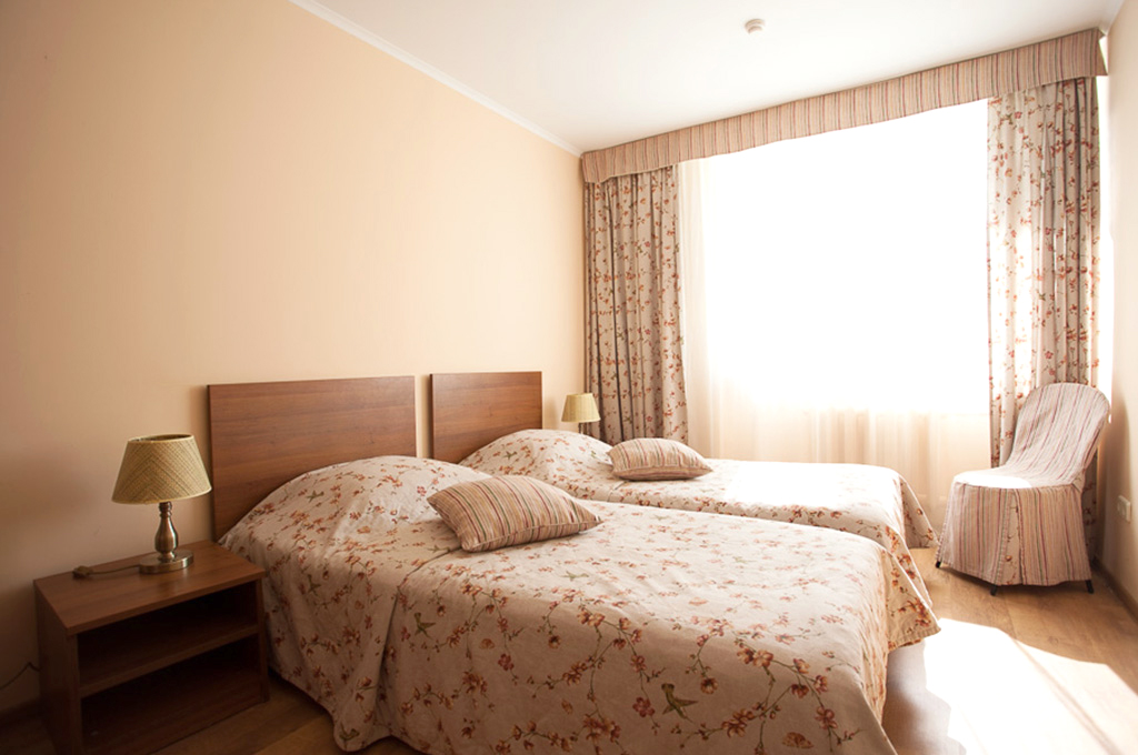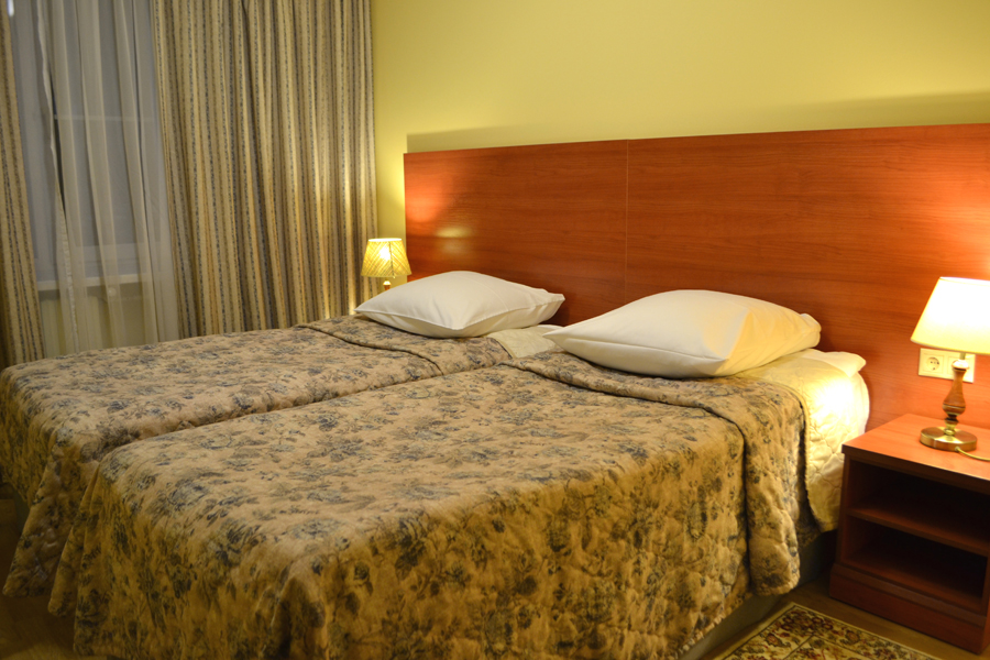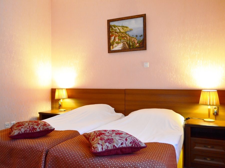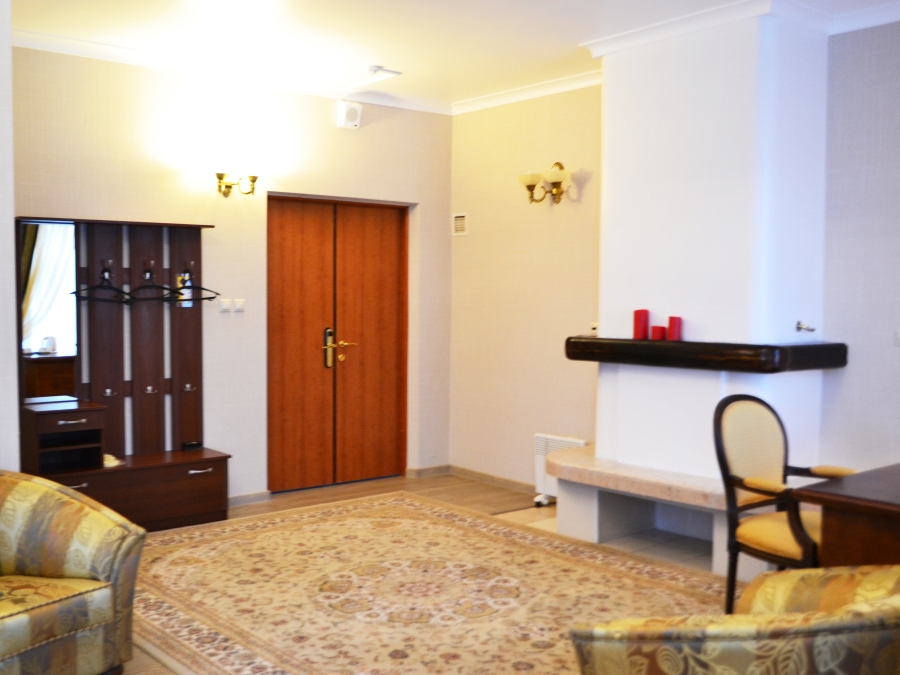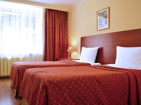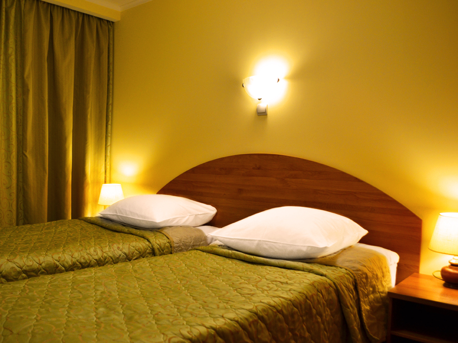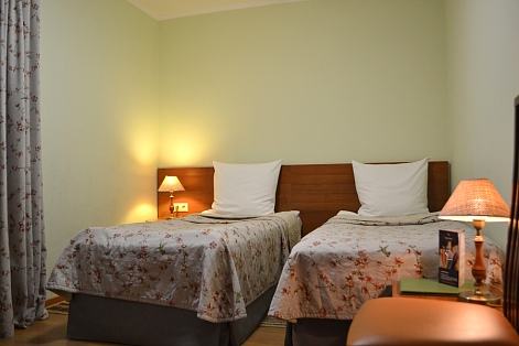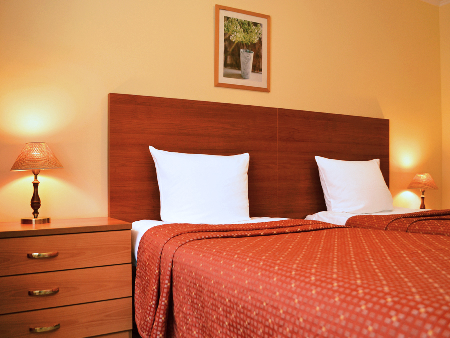 В номере: вешалка, зеркало, кровати односпальные /одна двуспальная кровать, прикроватные тумбочки, стол, столик журнальный, стулья, шкаф, мини-холодильник, набор посуды, телевизор, телефон