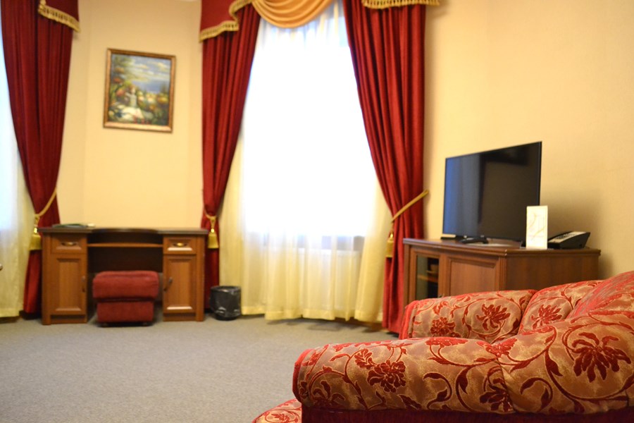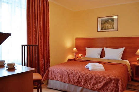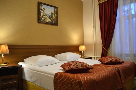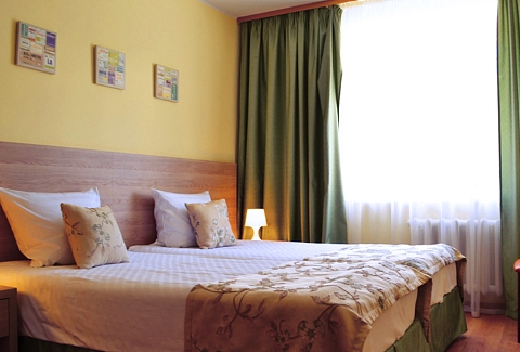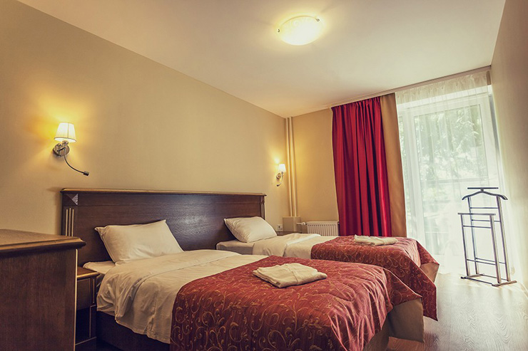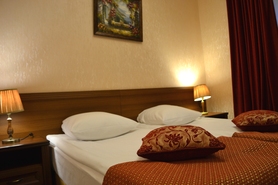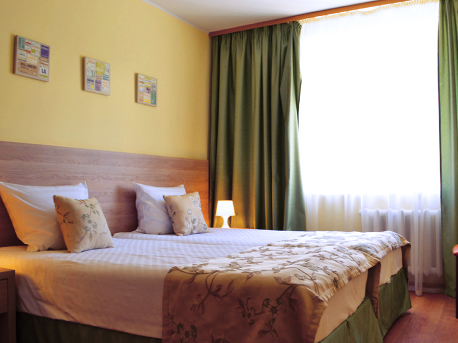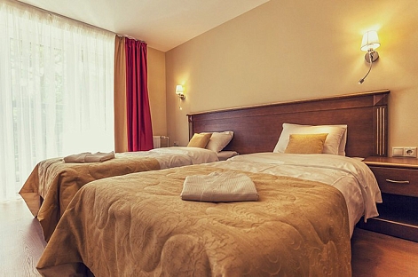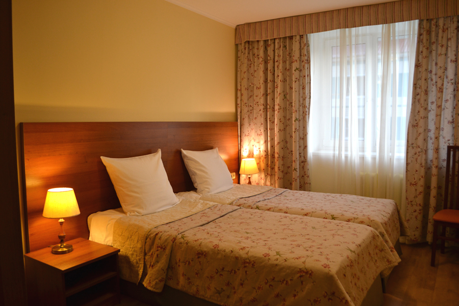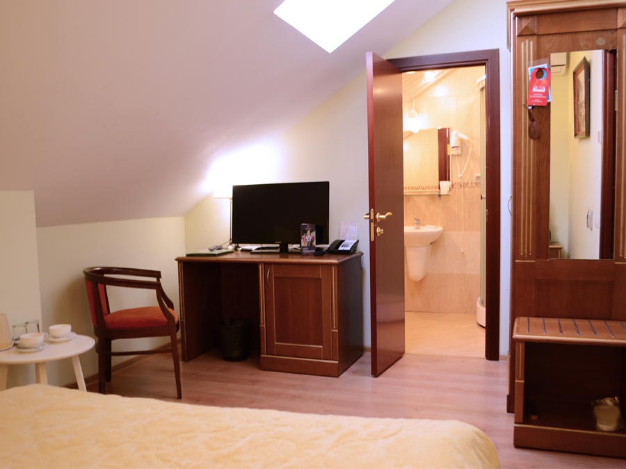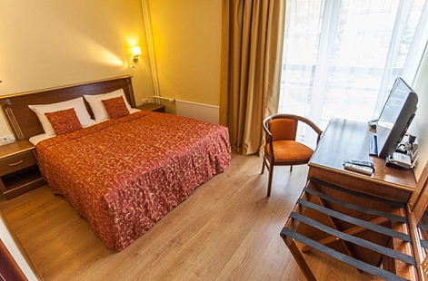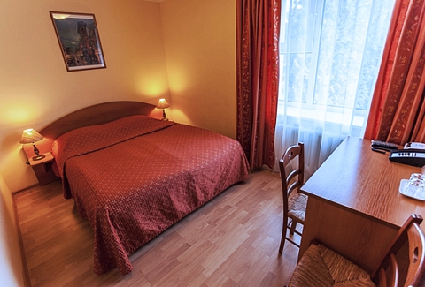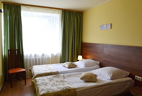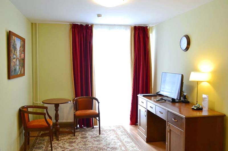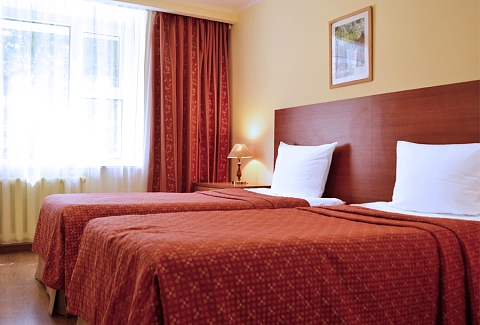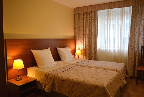 В номере: вешалка, зеркало, кровати односпальные /одна двуспальная кровать, прикроватные тумбочки, стол, столик журнальный, стулья, шкаф, мини-холодильник, набор посуды, телевизор, телефон