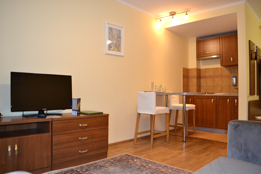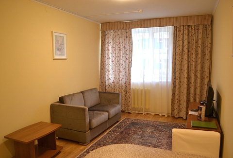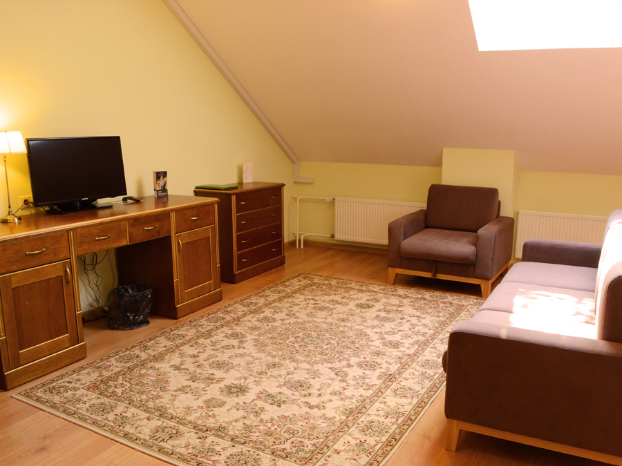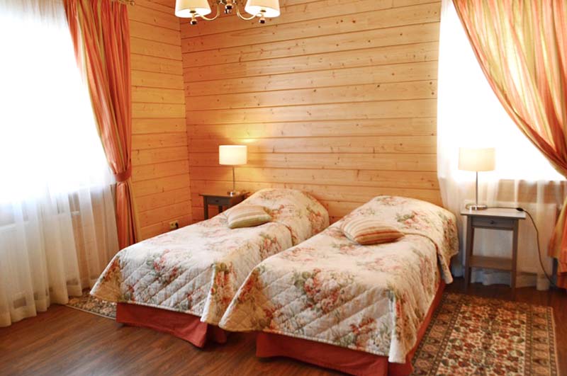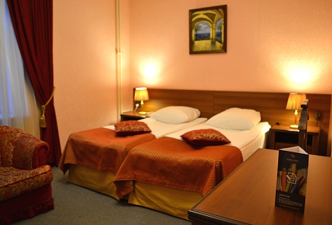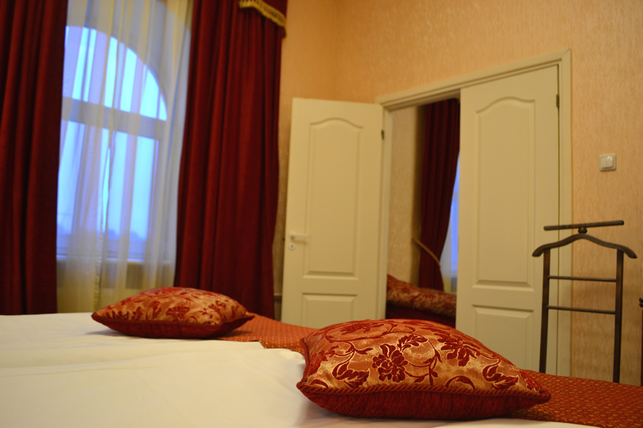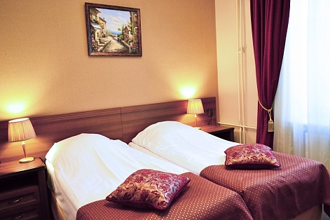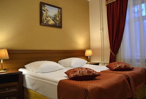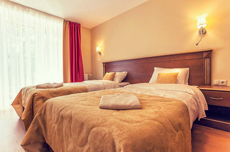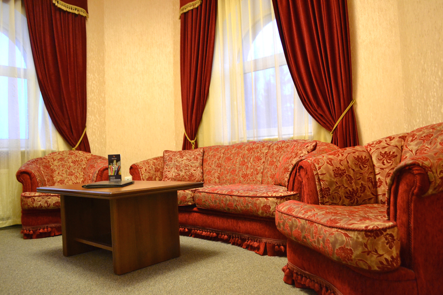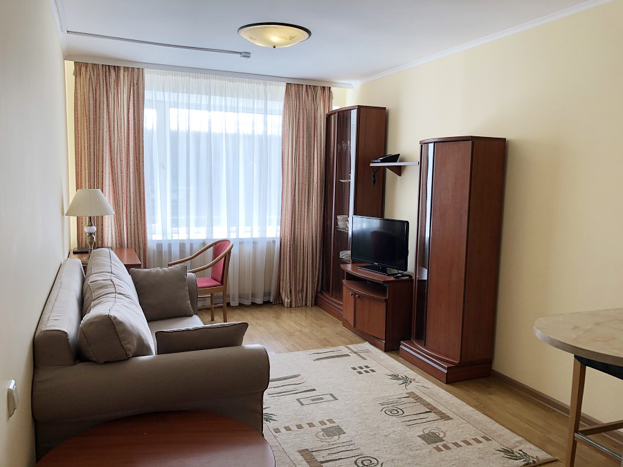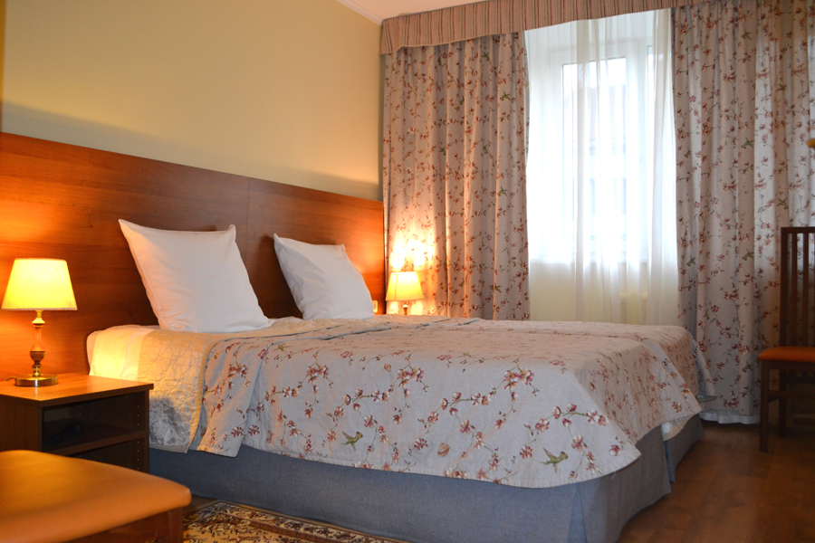 В номере: вешалка, зеркало, кровати односпальные /одна двуспальная кровать, прикроватные тумбочки, стол, столик журнальный, стулья, шкаф, мини-холодильник, набор посуды, телевизор, телефон