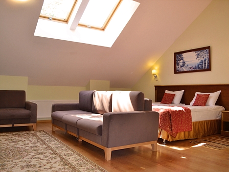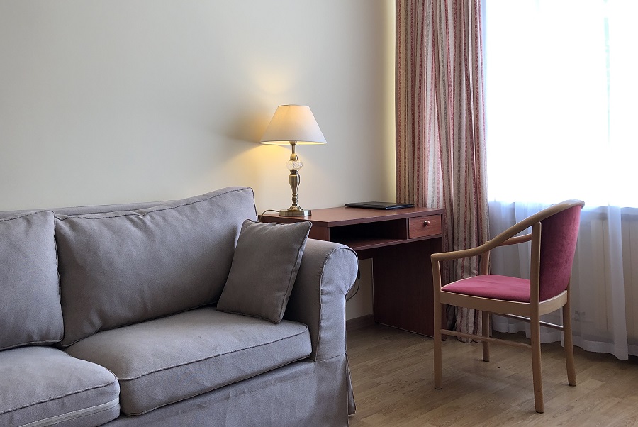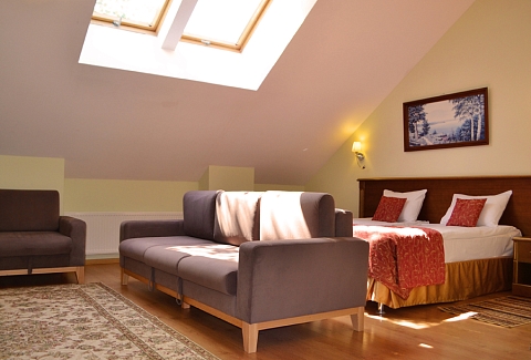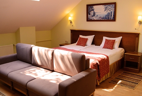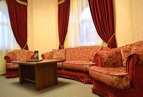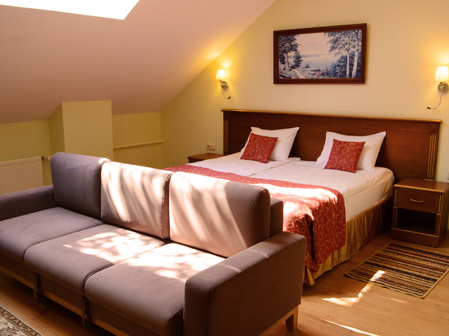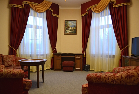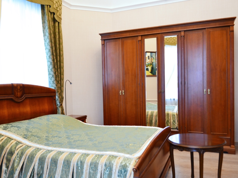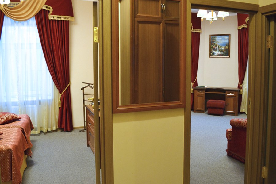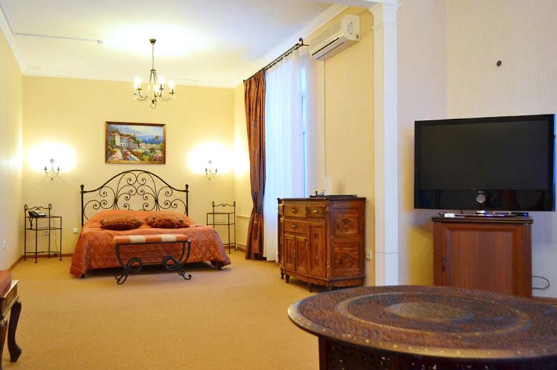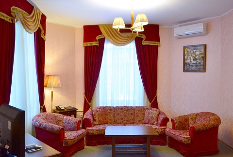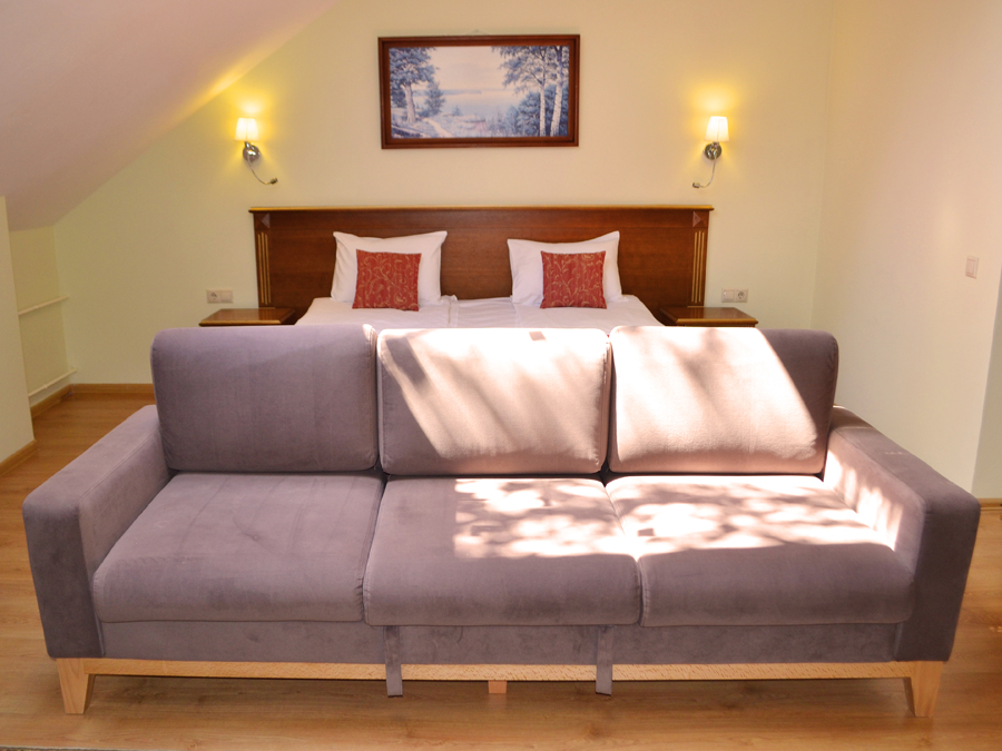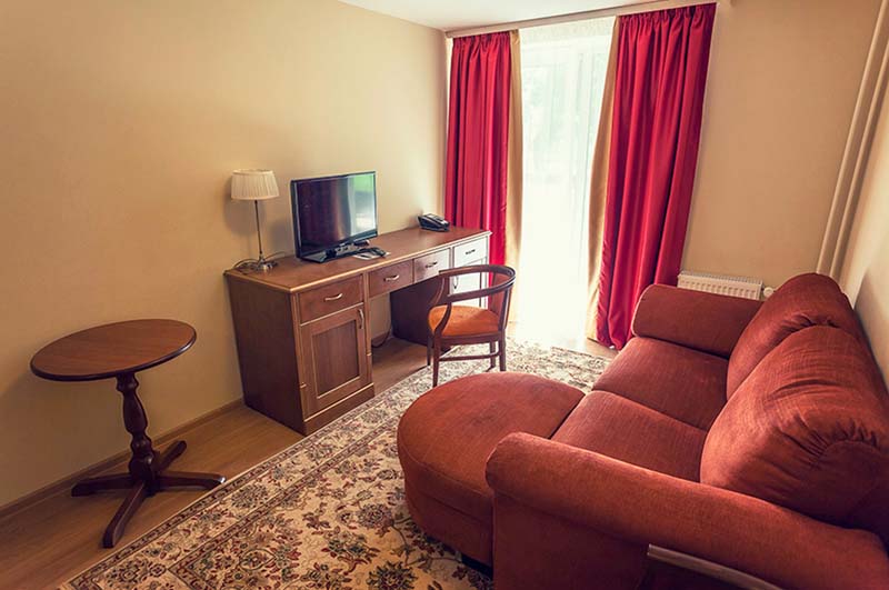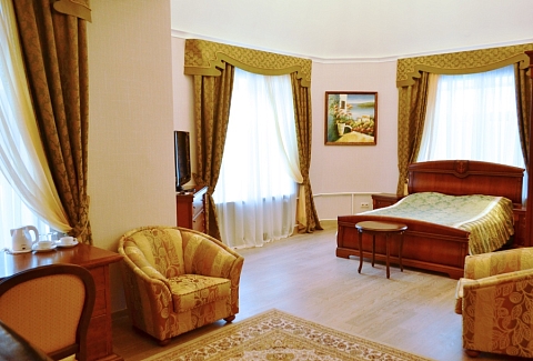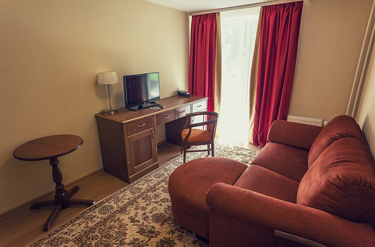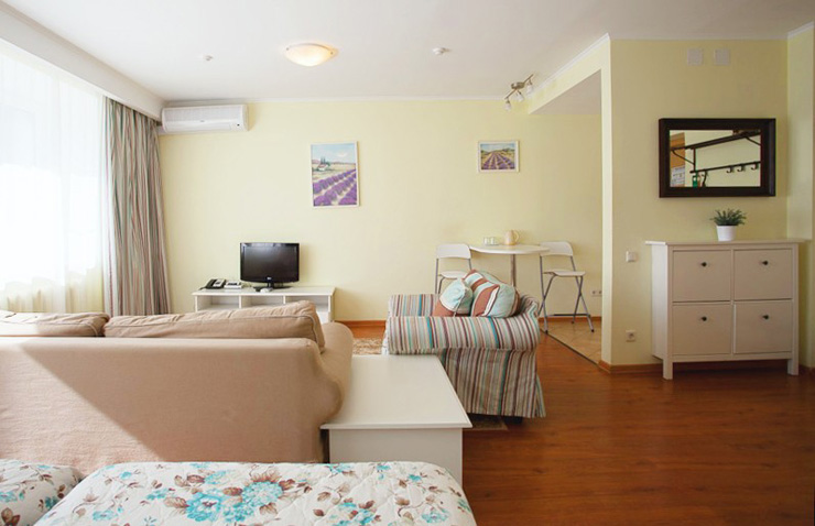 В номере: вешалка, диван раскладной, зеркало, кресла, кровати односпальные /одна двуспальная кровать, прикроватные тумбочки, стол, стулья, шкаф, кондиционер, мини-холодильник, набор посуды, телевизор, телефон, электрочайник