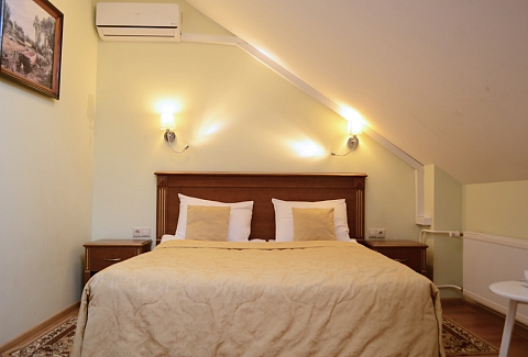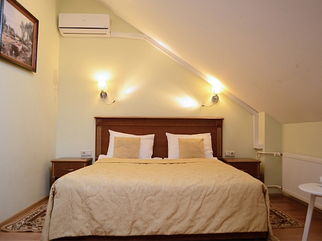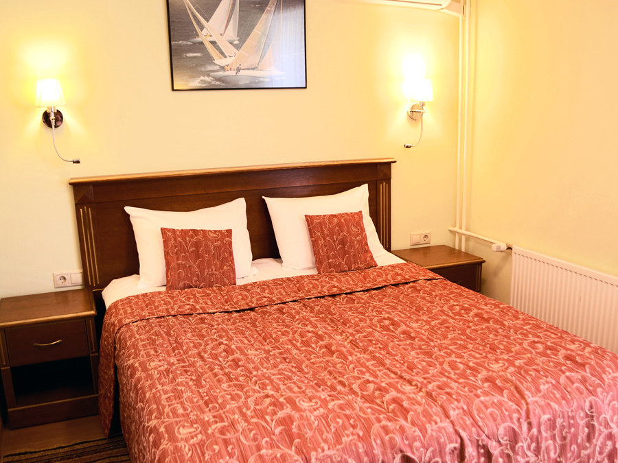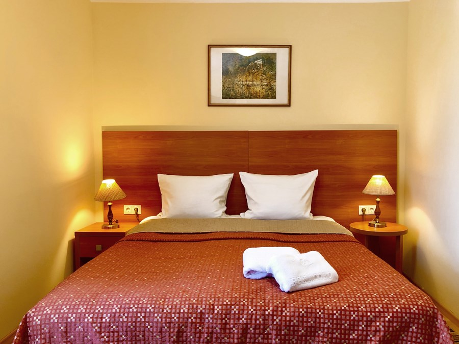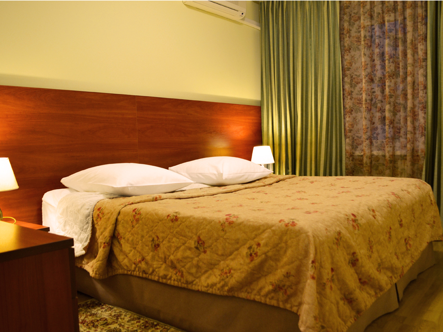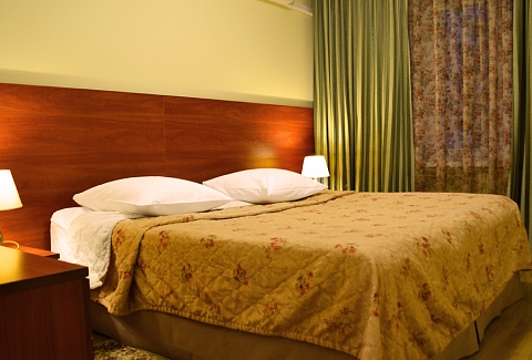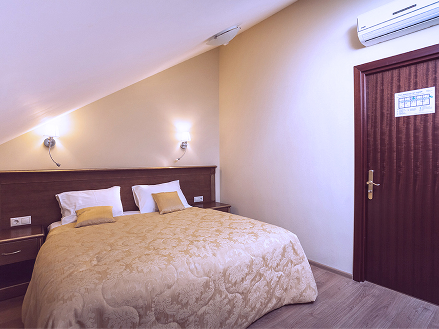 В номере: вешалка, зеркало, кровать двуспальная, прикроватные тумбочки, стол, стулья, шкаф, кондиционер, мини-холодильник, набор посуды, телевизор, телефон