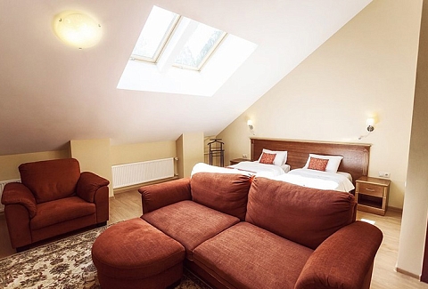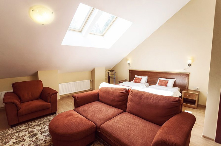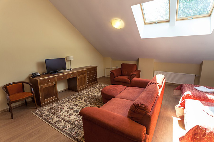 В номере: вешалка, диван раскладной, зеркало, кресла, кровати односпальные, кровати односпальные /одна двуспальная кровать, прикроватные тумбочки, стол, стулья, шкаф, мини-холодильник, набор посуды, телевизор, телефон