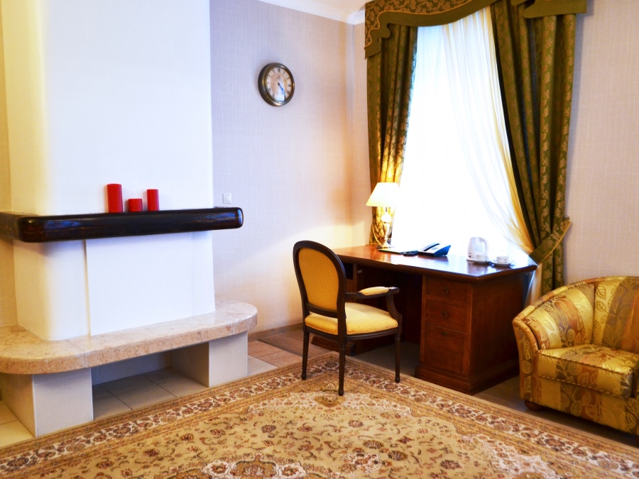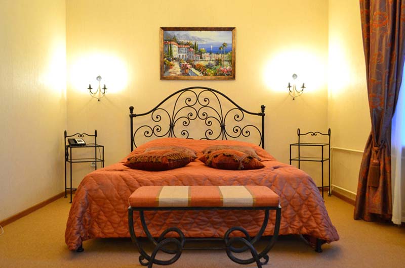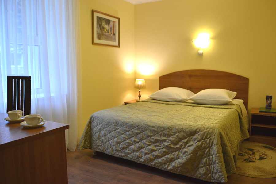 В номере: вешалка, зеркало, кресла, кровать двуспальная, прикроватные тумбочки, стол, стул, шкаф, мини-холодильник, телевизор, телефон, чайный набор посуды, электрочайник