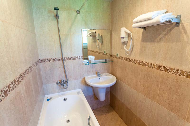 Санузел: с душем или ванной, тапочки, туалетные принадлежности, фен