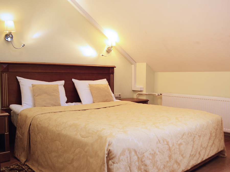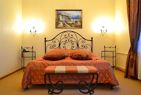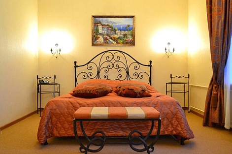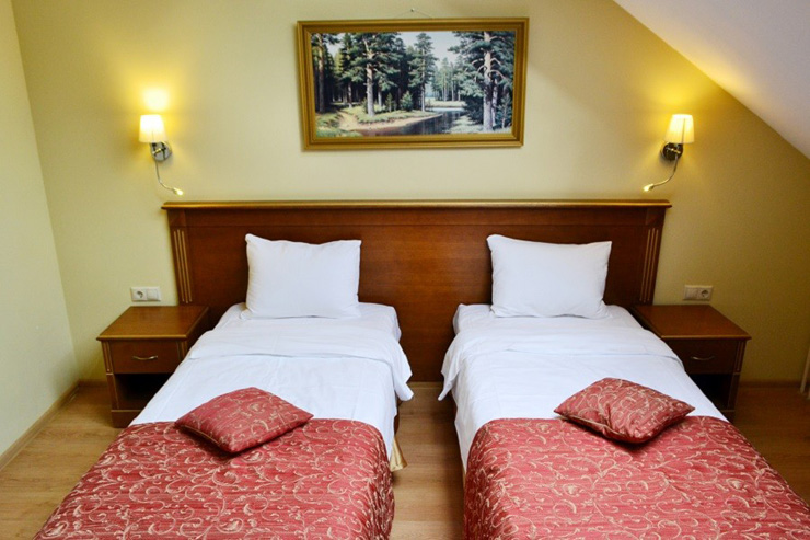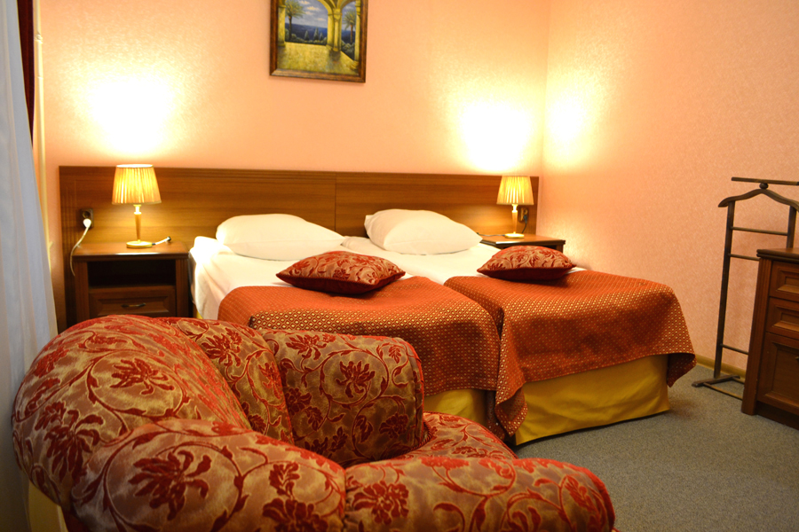 В номере: вешалка, зеркало, кресло, кровати односпальные /одна двуспальная кровать, прикроватные тумбочки, стол, стул, шкаф, мини-холодильник, набор посуды, телевизор, телефон