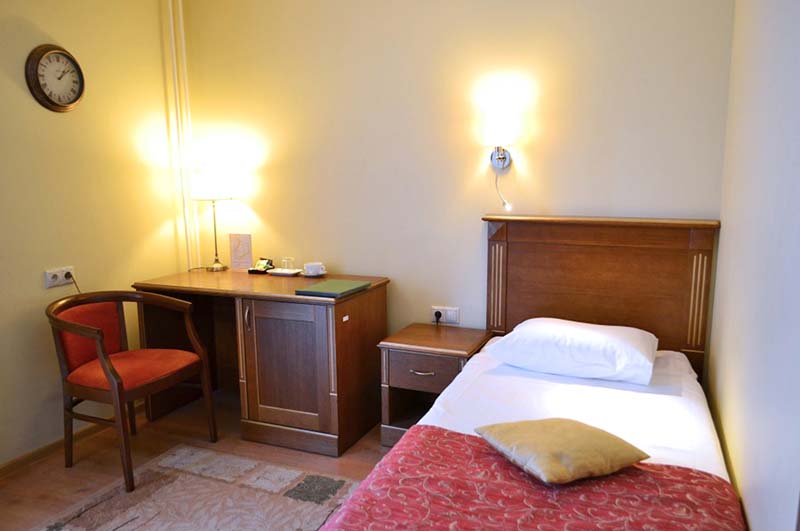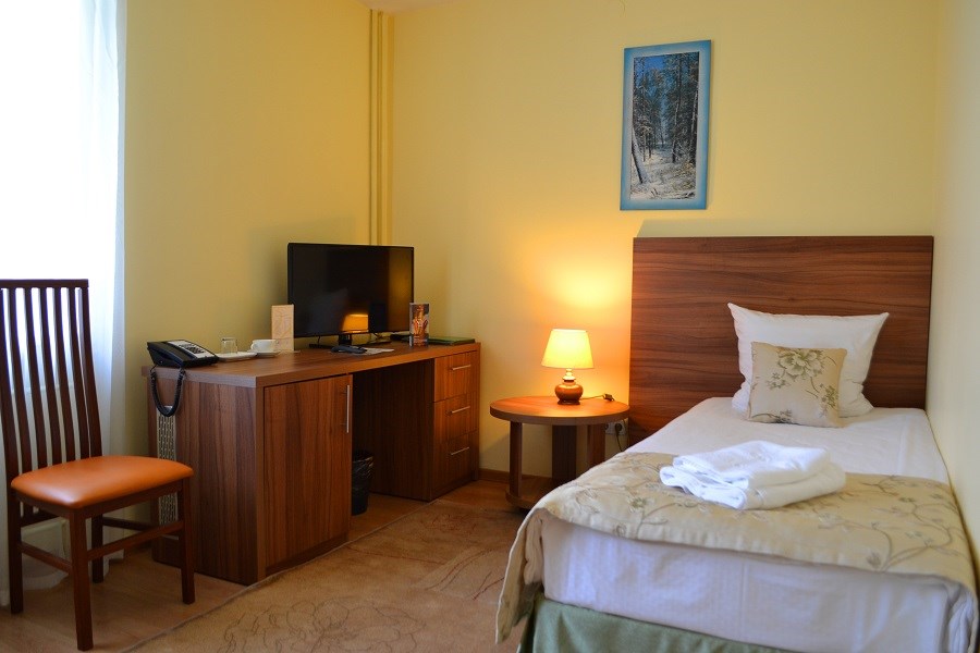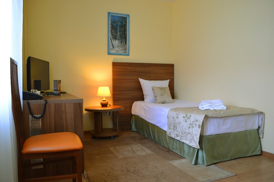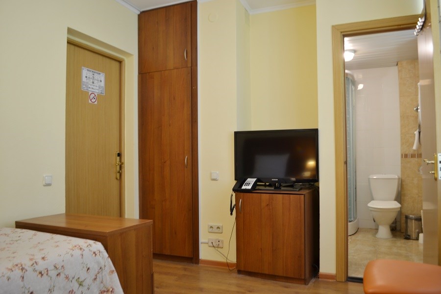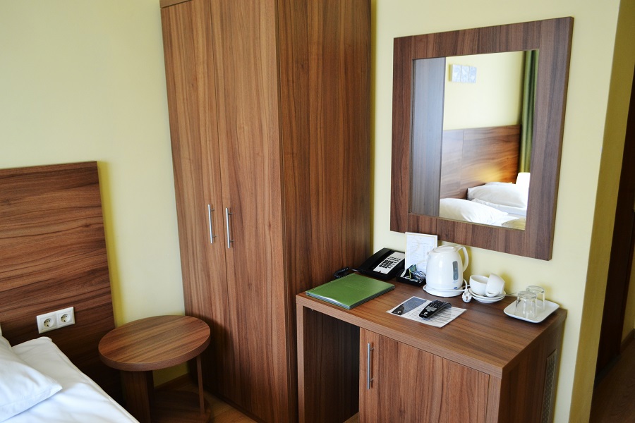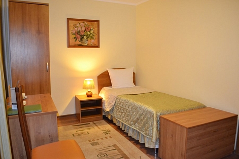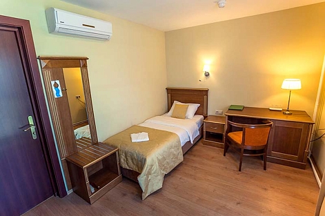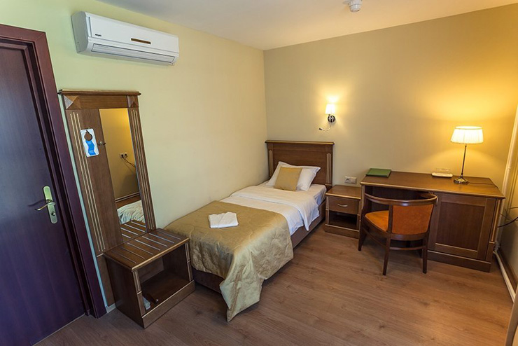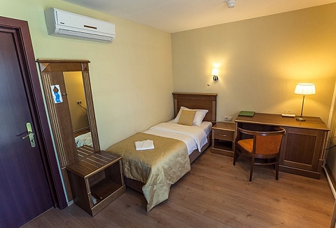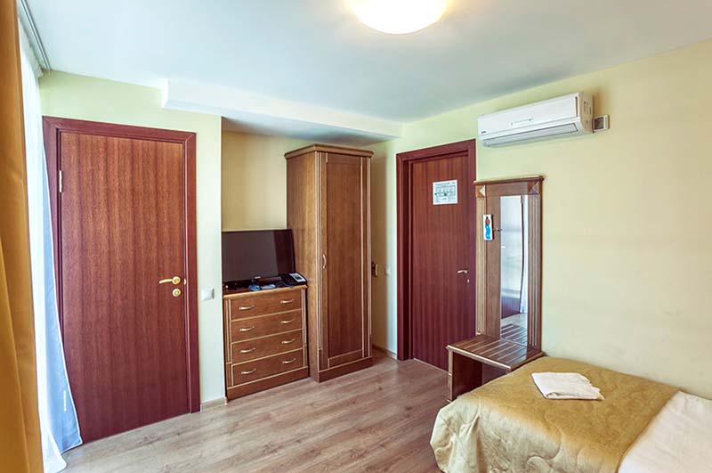 В номере: вешалка, зеркало, кровать односпальная, прикроватная тумбочка, стол, стул, шкаф, кондиционер, мини-холодильник, набор посуды, телевизор, телефон