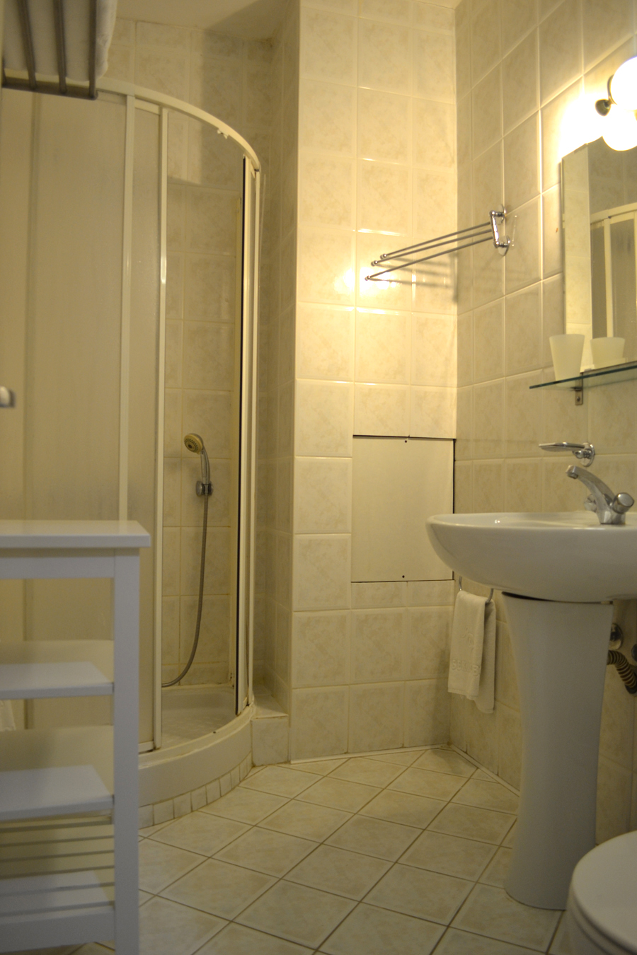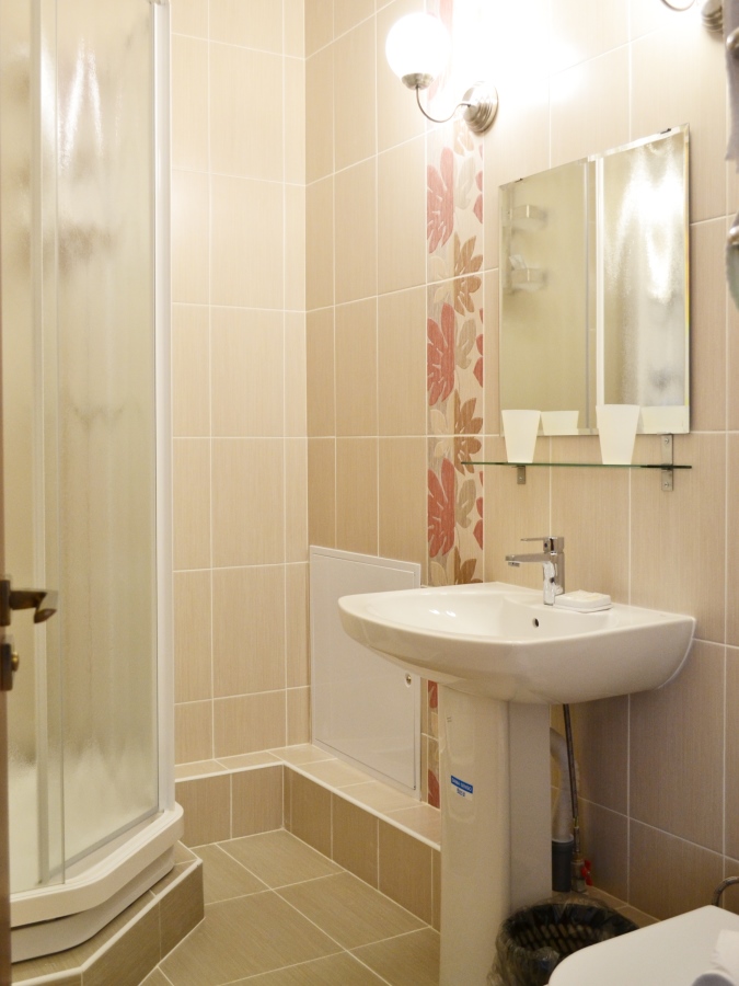 Санузел: с душевой кабиной, тапочки, туалетные принадлежности, фен