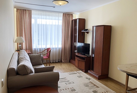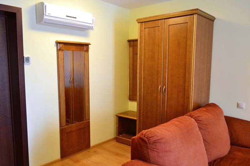 В номере: вешалка, диван раскладной, зеркало, кровати односпальные /одна двуспальная кровать, прикроватные тумбочки, стол, столик журнальный, стулья, шкаф, кондиционер, мини-холодильник, телевизор, телефон, чайный набор посуды