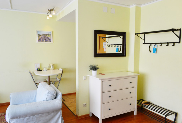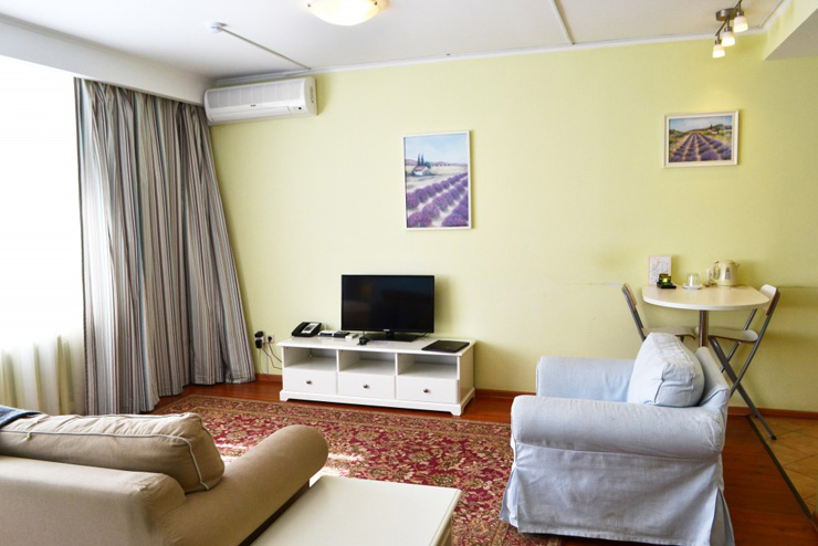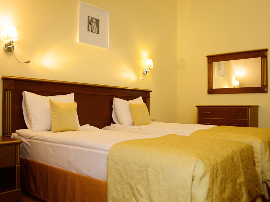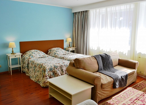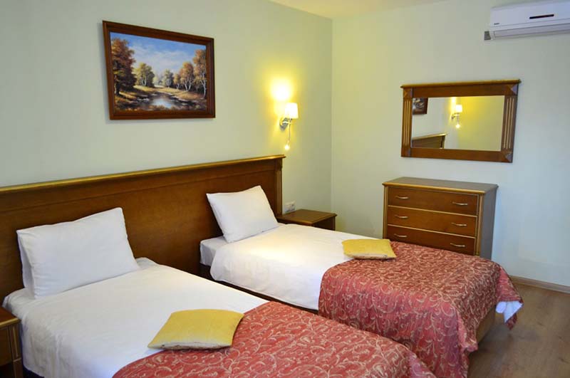 В номере: вешалка, диван раскладной, зеркало, комод, кресло, кровати односпальные, прикроватные тумбочки, стол, стулья, шкаф, кондиционер, мини-холодильник, набор посуды, телевизор, телефон, электрочайник