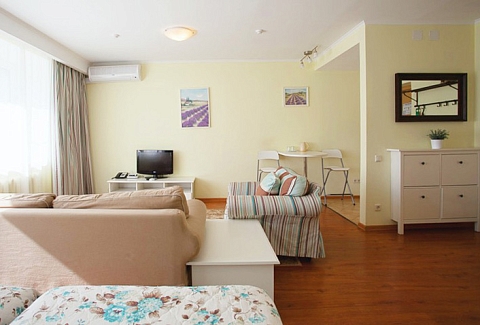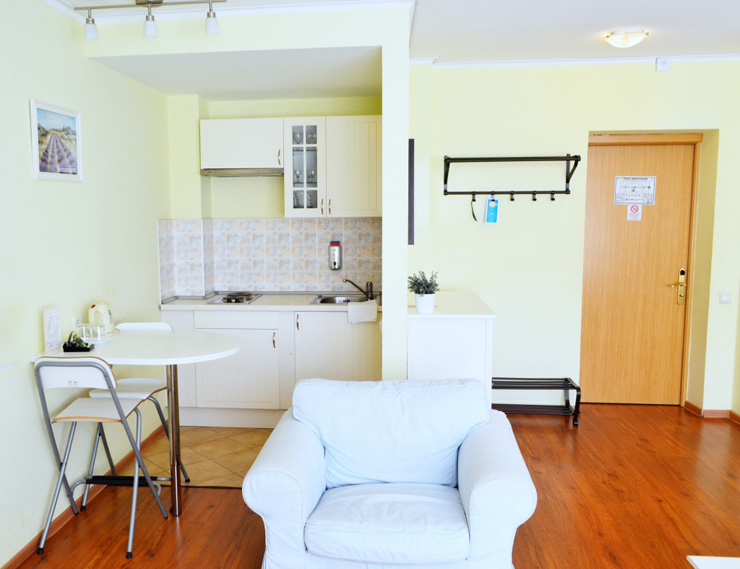 В номере: вешалка, диван, зеркало, кровати односпальные /одна двуспальная кровать, прикроватные тумбочки, стол, стулья, тумба, шкаф, кондиционер, микроволновая печь, мини-холодильник, набор посуды, плита электрическая, телевизор, телефон
