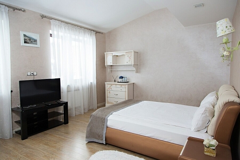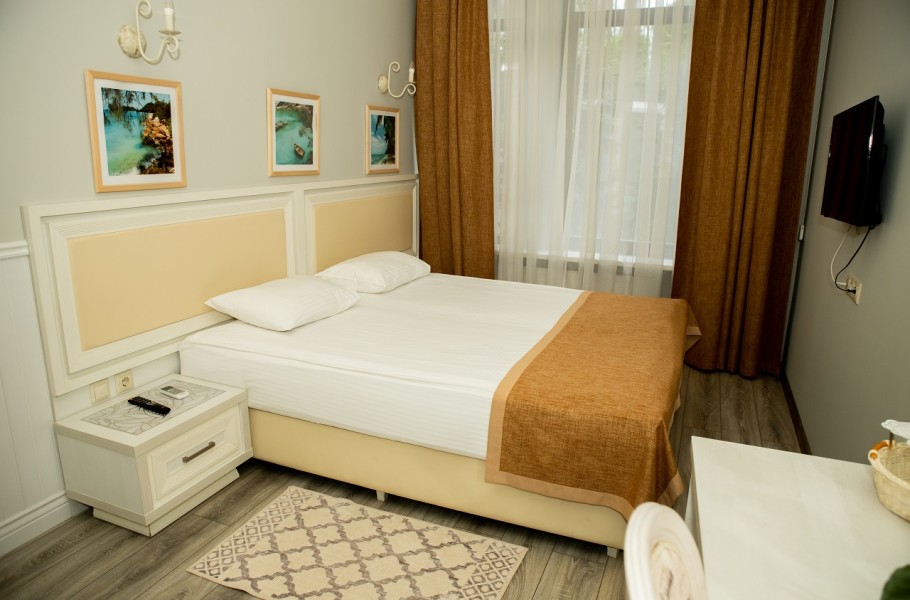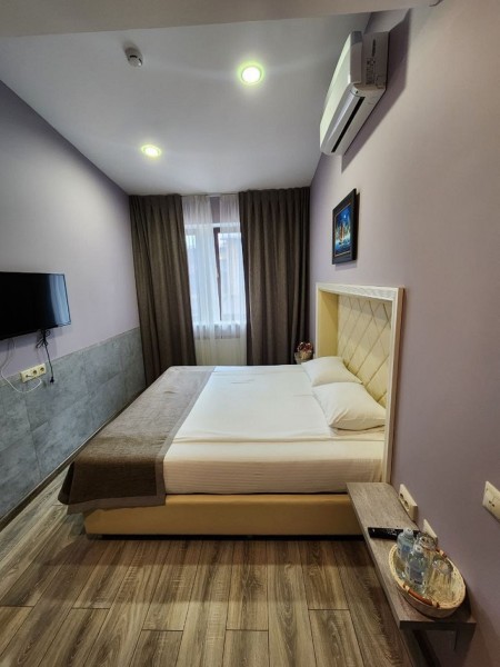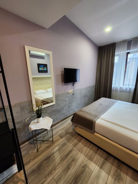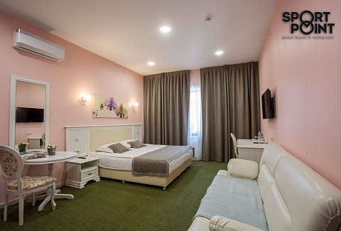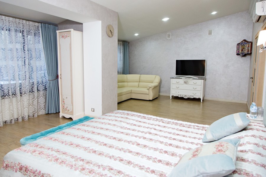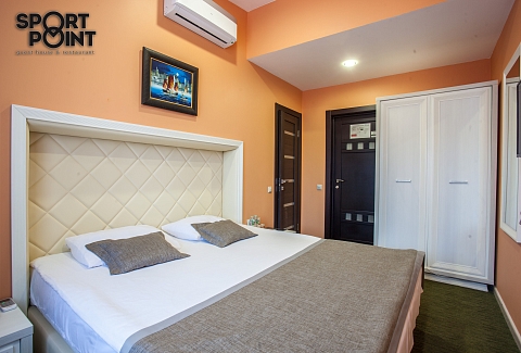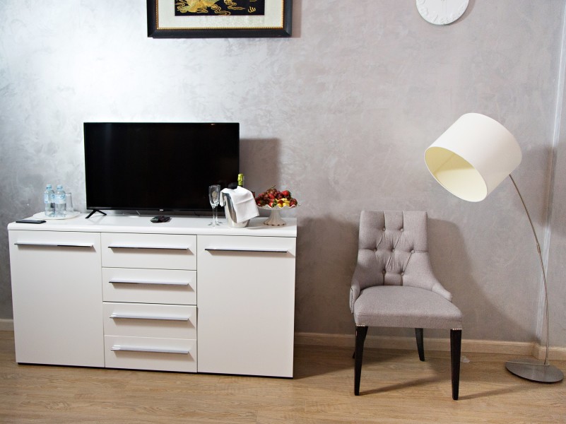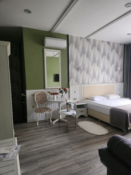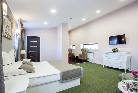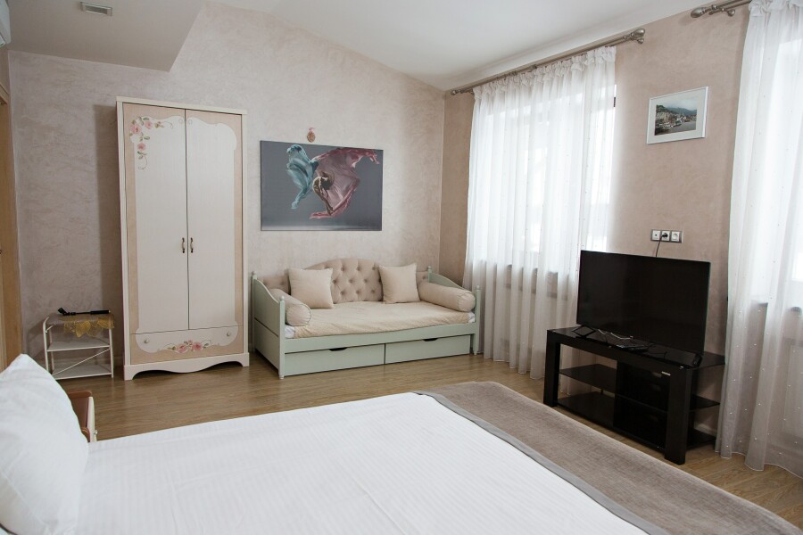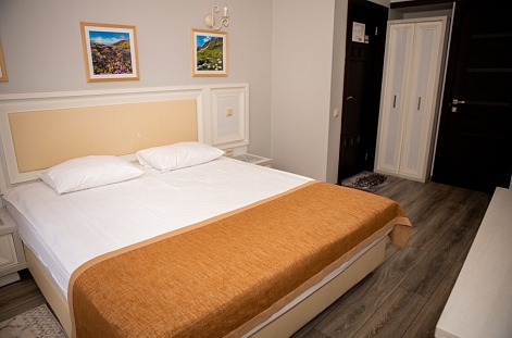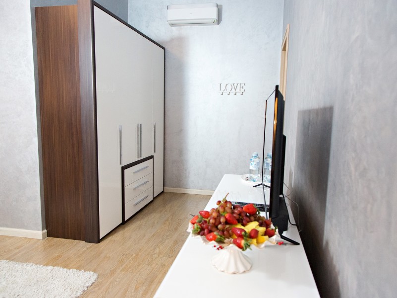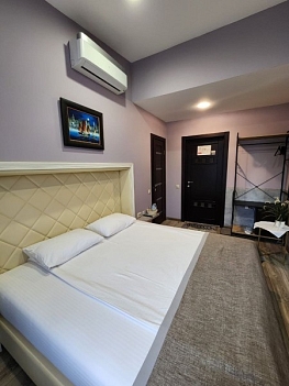 В номере: диван, зеркало, кровать двуспальная, стол, стулья, шкаф, кондиционер, мини-холодильник, набор посуды, телевизор, чайник