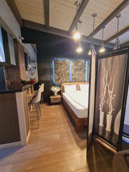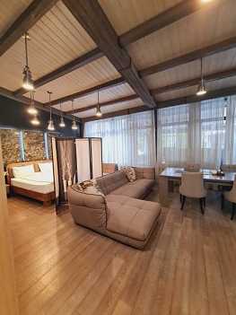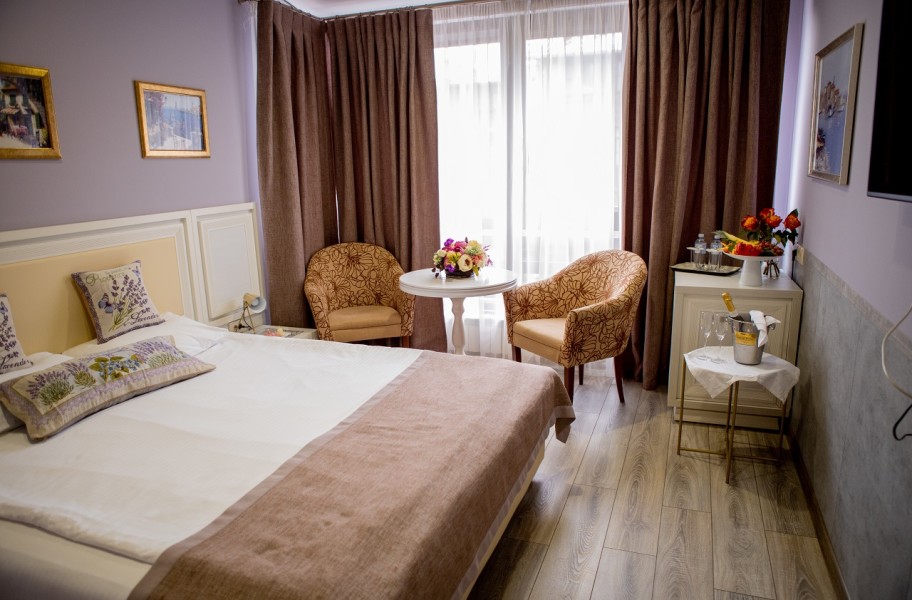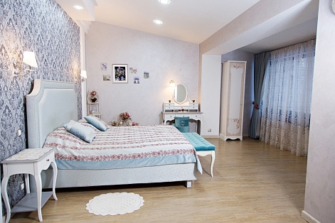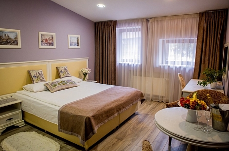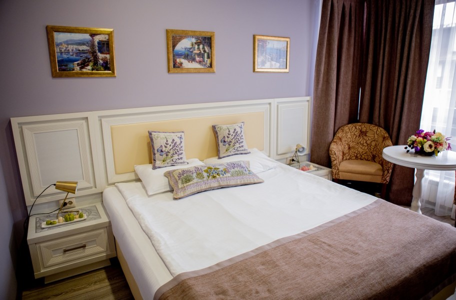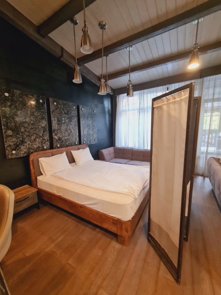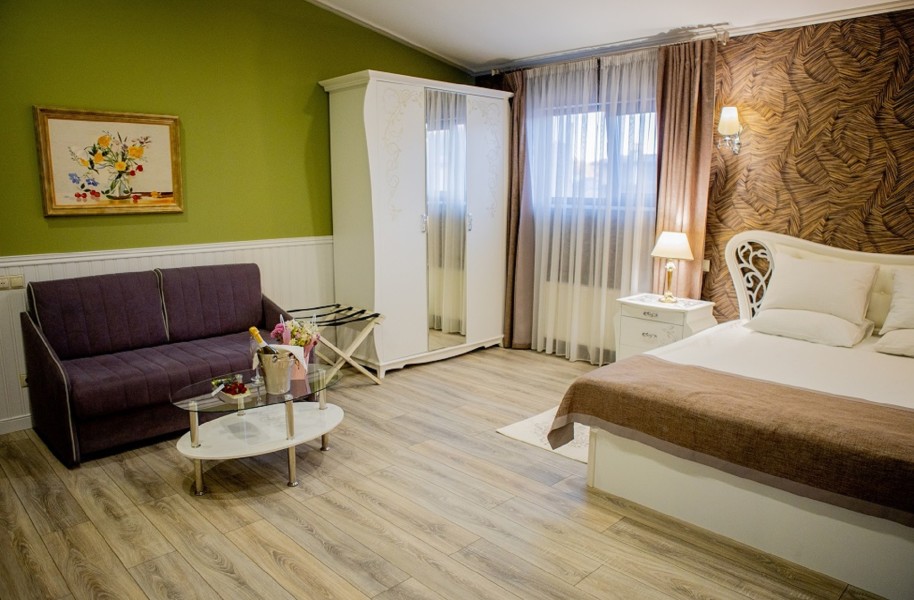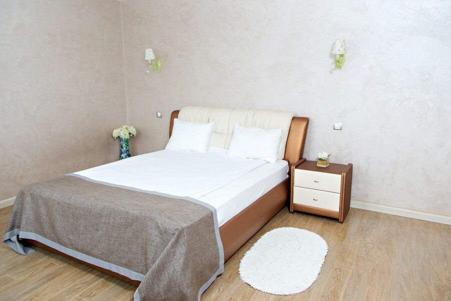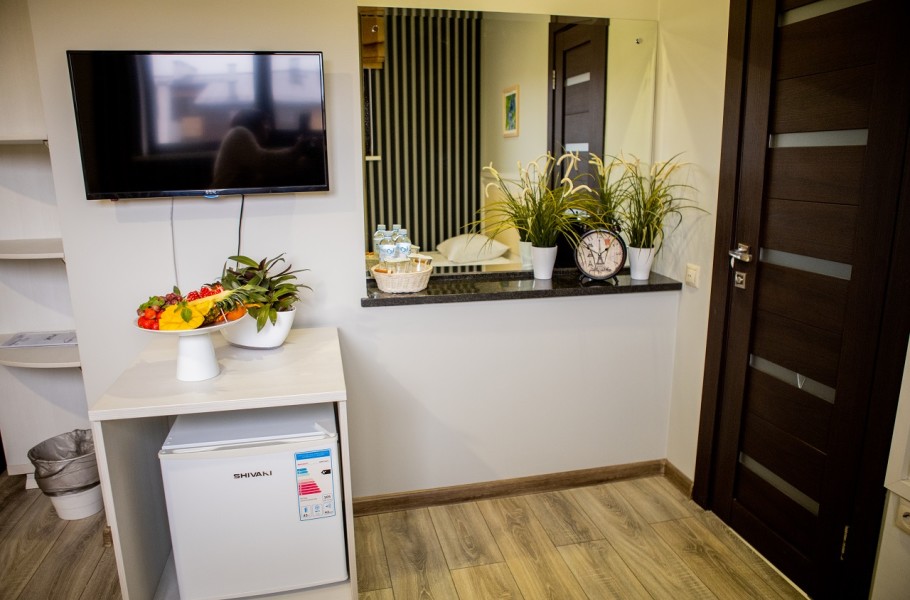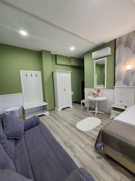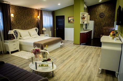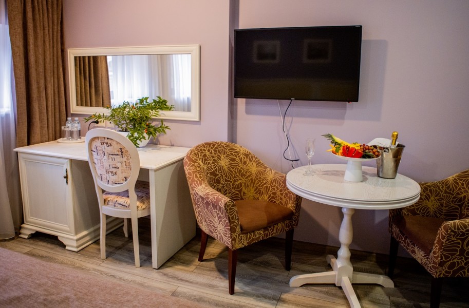В номере: диван, зеркало, кровать двуспальная, стол, стулья, шкаф, кондиционер, мини-холодильник, набор посуды, телевизор, чайник