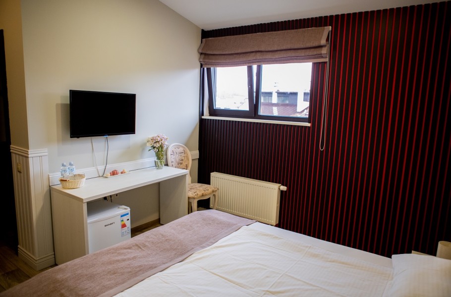 В номере: вешалка, зеркало, кровать двуспальная, прикроватные тумбочки, стол, стул, шкаф, кондиционер, мини-холодильник, телевизор