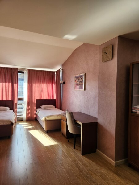 В номере: вешалка, диван раскладной, зеркало, кровати односпальные, кровать двуспальная, стол, стул, шкаф, кондиционер, мини-холодильник, телевизор