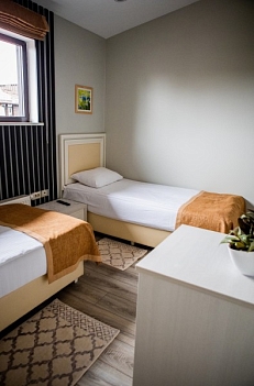 В номере: вешалка, зеркало, кровати односпальные, прикроватные тумбочки, стол, стулья, шкаф, кондиционер, мини-холодильник, телевизор
