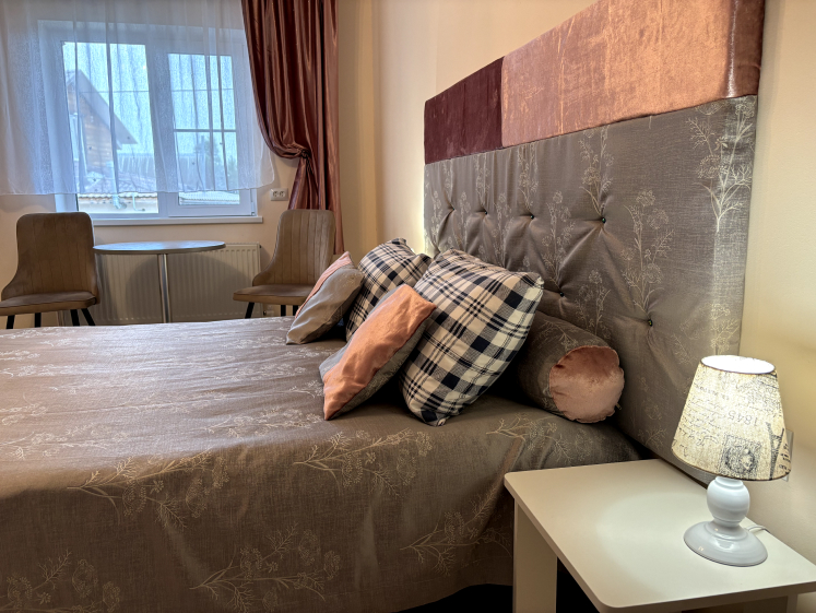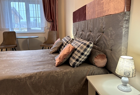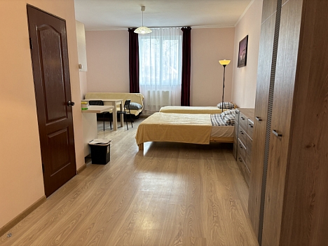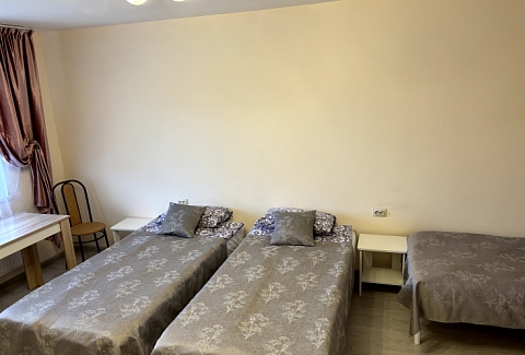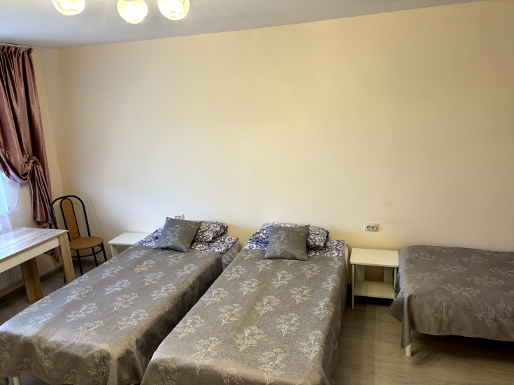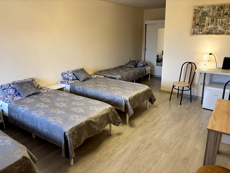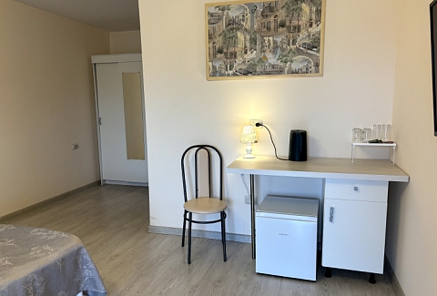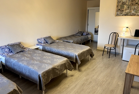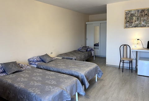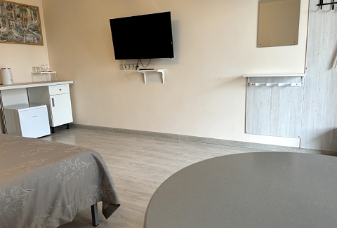 В номере: зеркало, кровати односпальные /одна двуспальная кровать, прикроватные тумбочки, стол, стулья, шкаф, мини-холодильник, телевизор ЖК, электрочайник