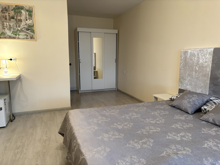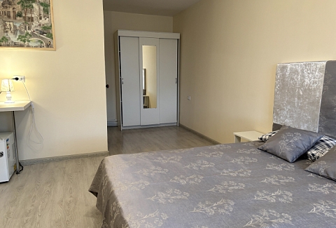 В номере: диван, зеркало, кровать двуспальная, стол, стулья, шкаф, кондиционер, микроволновая печь, мини-холодильник, набор посуды, телевизор ЖК, утюг, чайный набор посуды, электрочайник