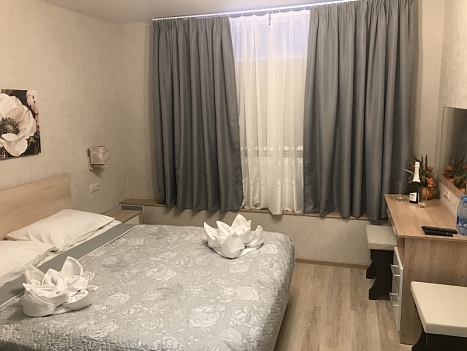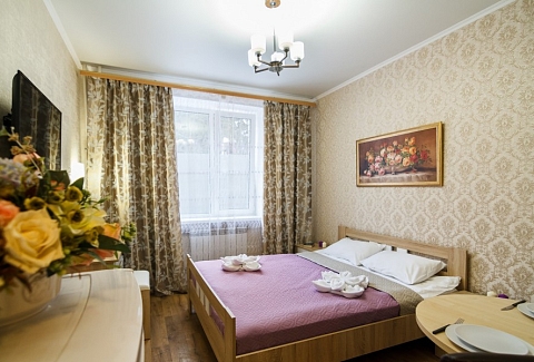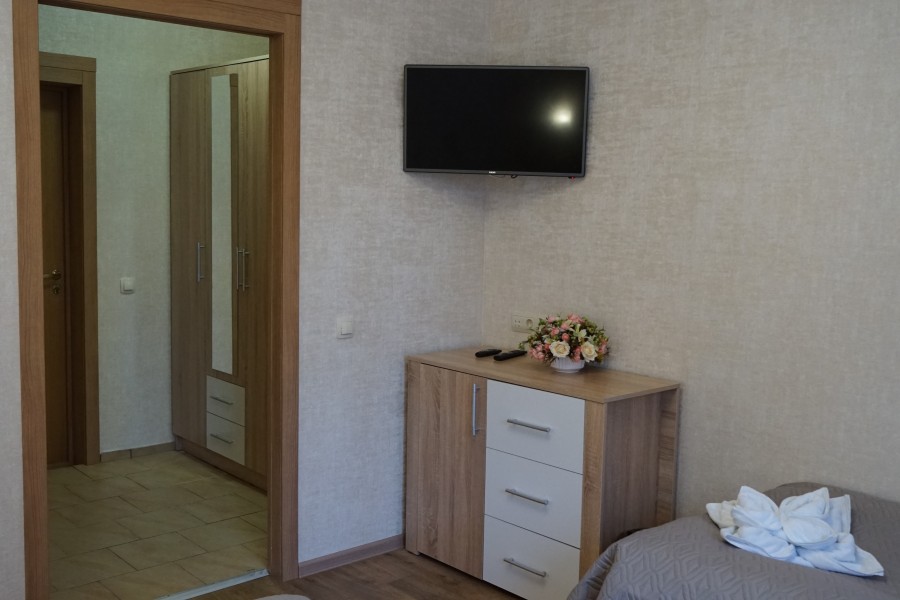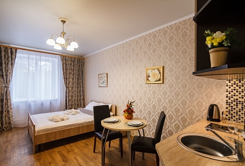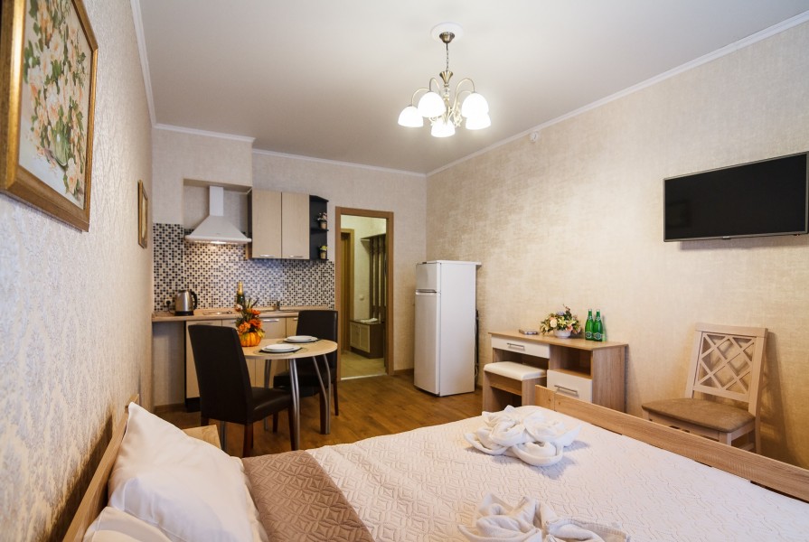 В номере: зеркало, кровать двуспальная, прикроватные тумбочки, стол, стулья, шкаф, набор посуды, плита электрическая, телевизор, холодильник, электрочайник