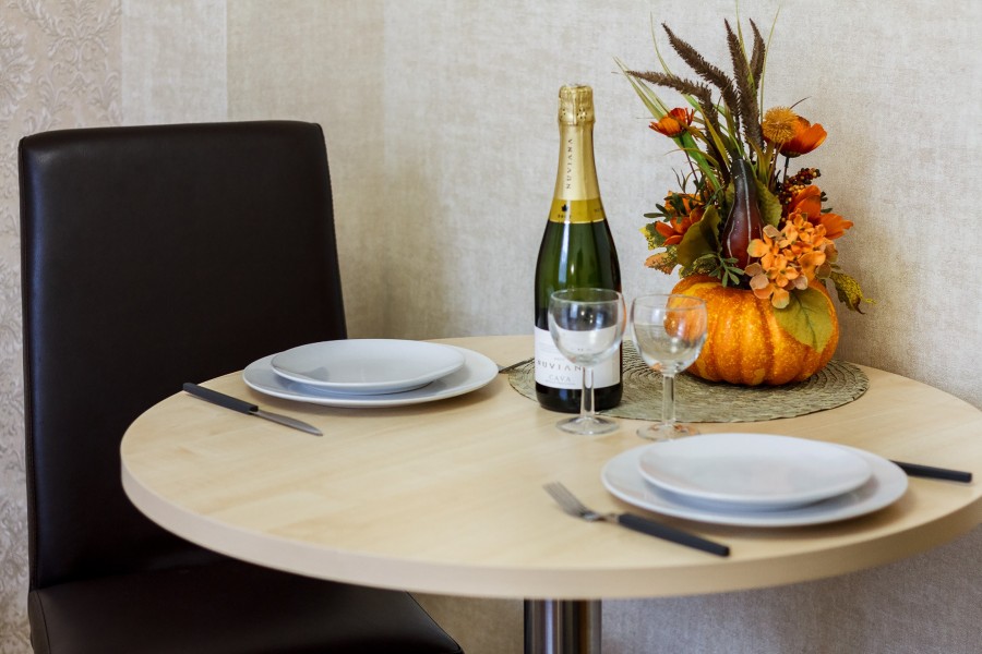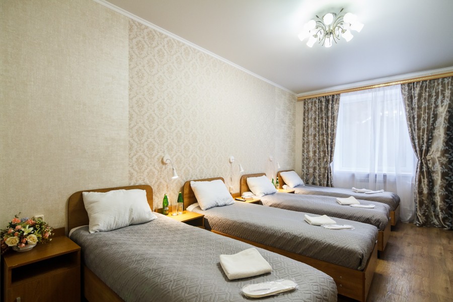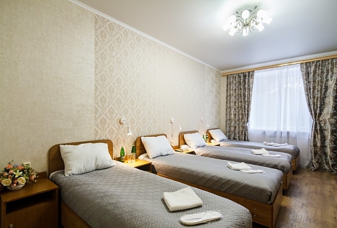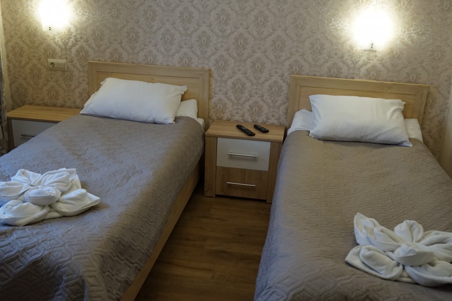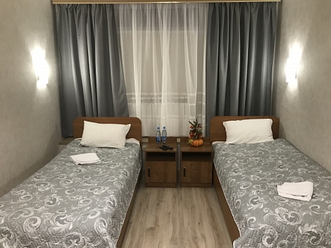 В номере: зеркало, кровати односпальные, прикроватные тумбочки, стол, стулья, шкаф, набор посуды, плита электрическая, телевизор, холодильник, электрочайник
