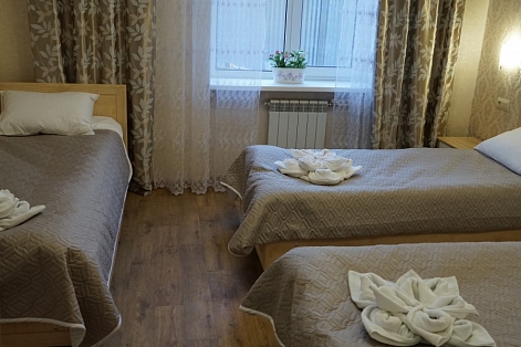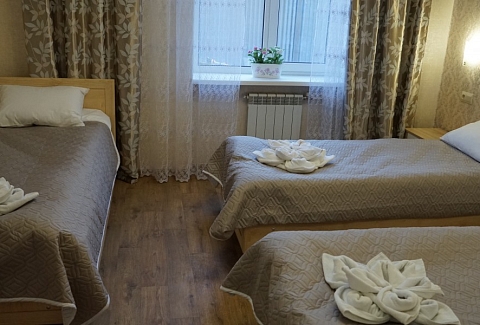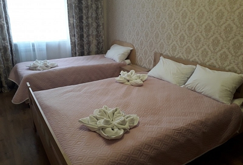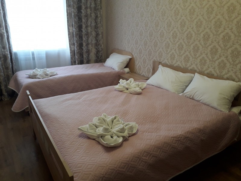 В номере: зеркало, кровать двуспальная, кровать односпальная, прикроватные тумбочки, стол, стулья, шкаф, набор посуды, плита электрическая, телевизор, холодильник, электрочайник