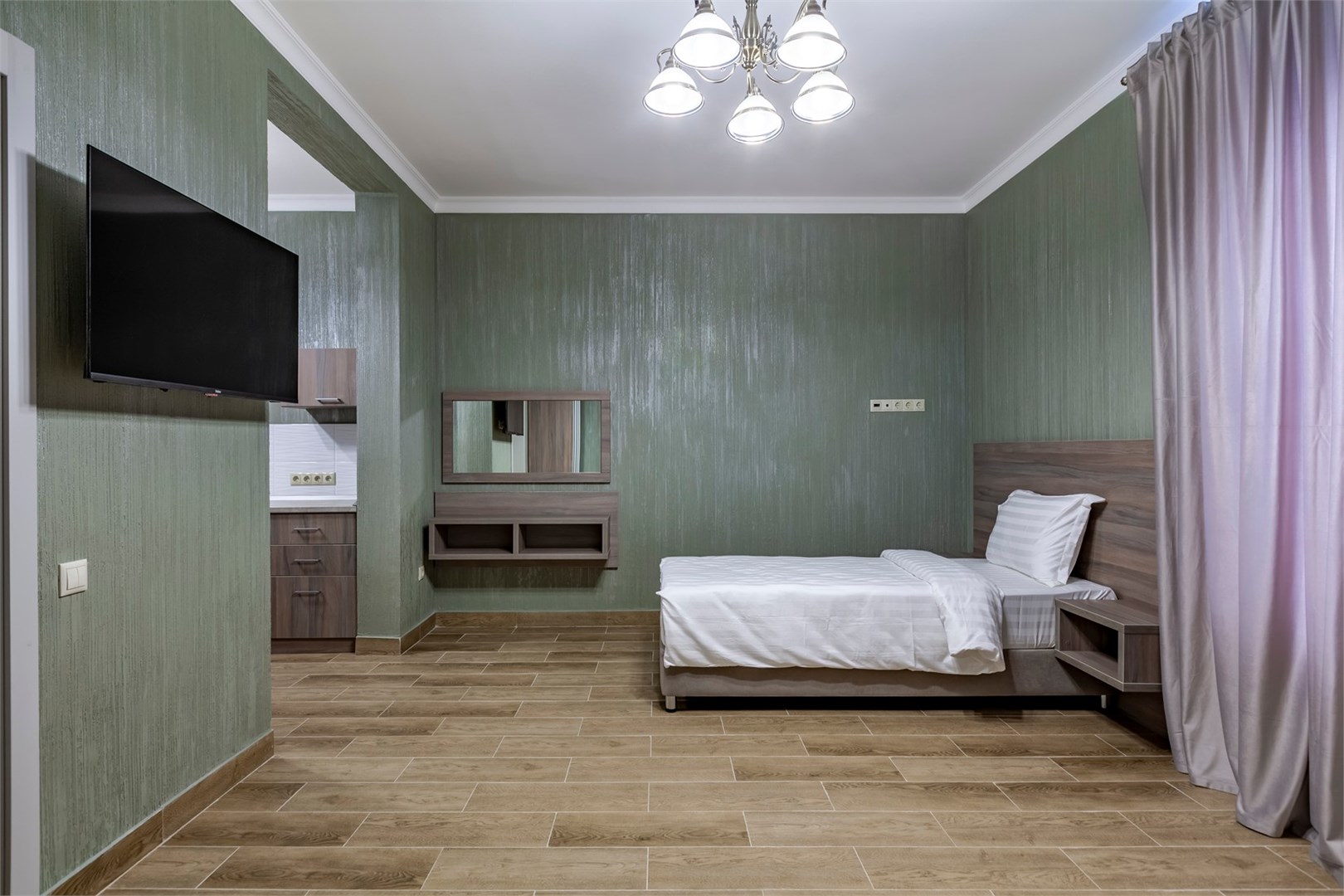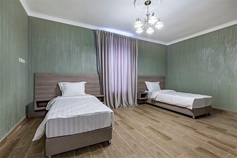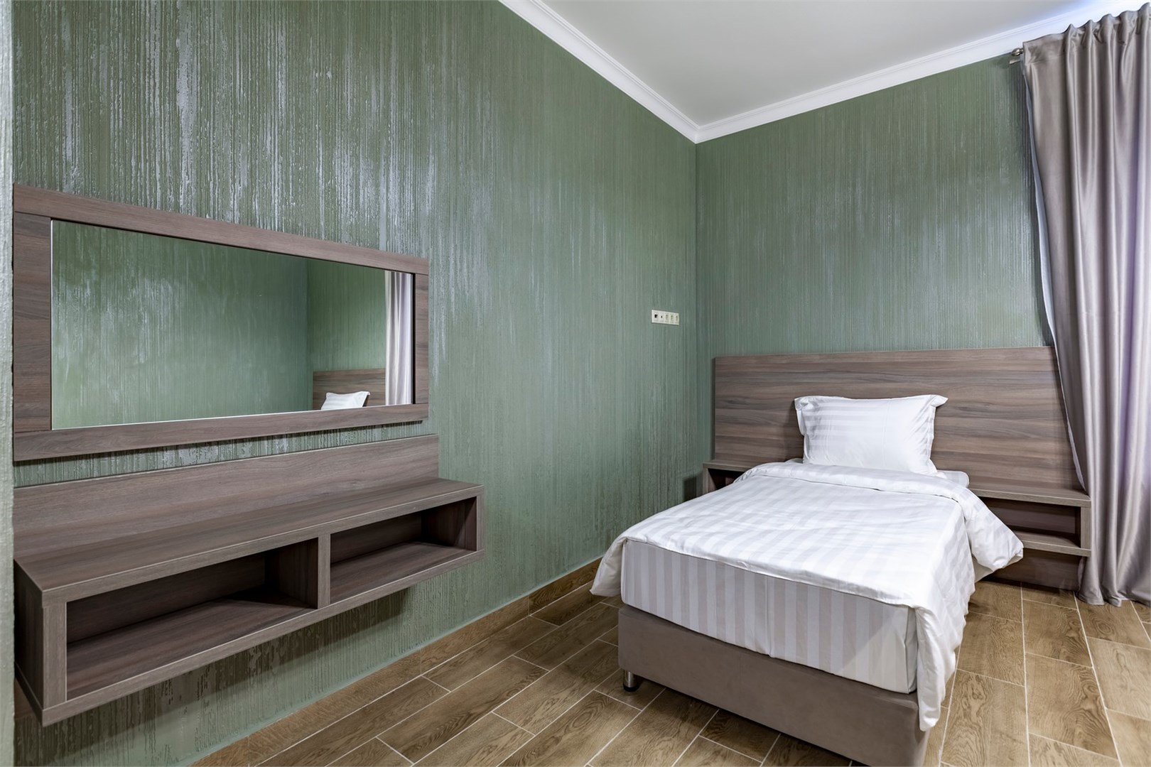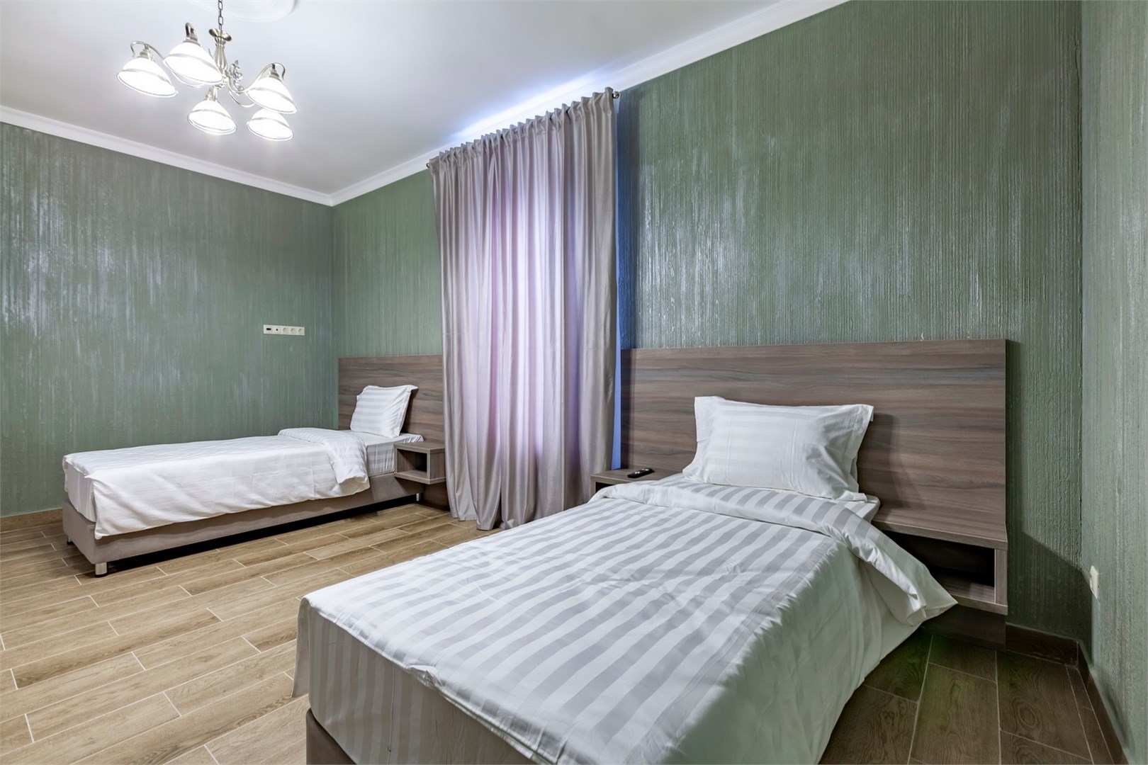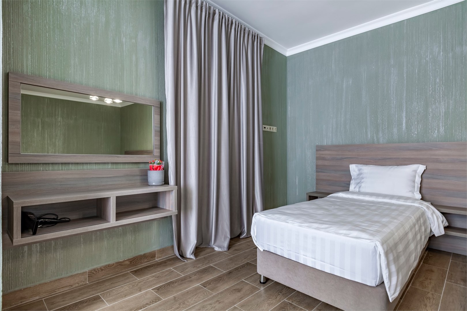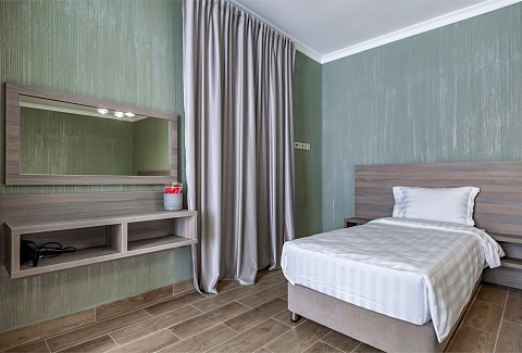 В номере: вешалка, зеркало, кровати односпальные, стол, стулья, шкаф, кондиционер, мини-холодильник, набор посуды, телевизор ЖК, утюг, чайный набор посуды, электрочайник