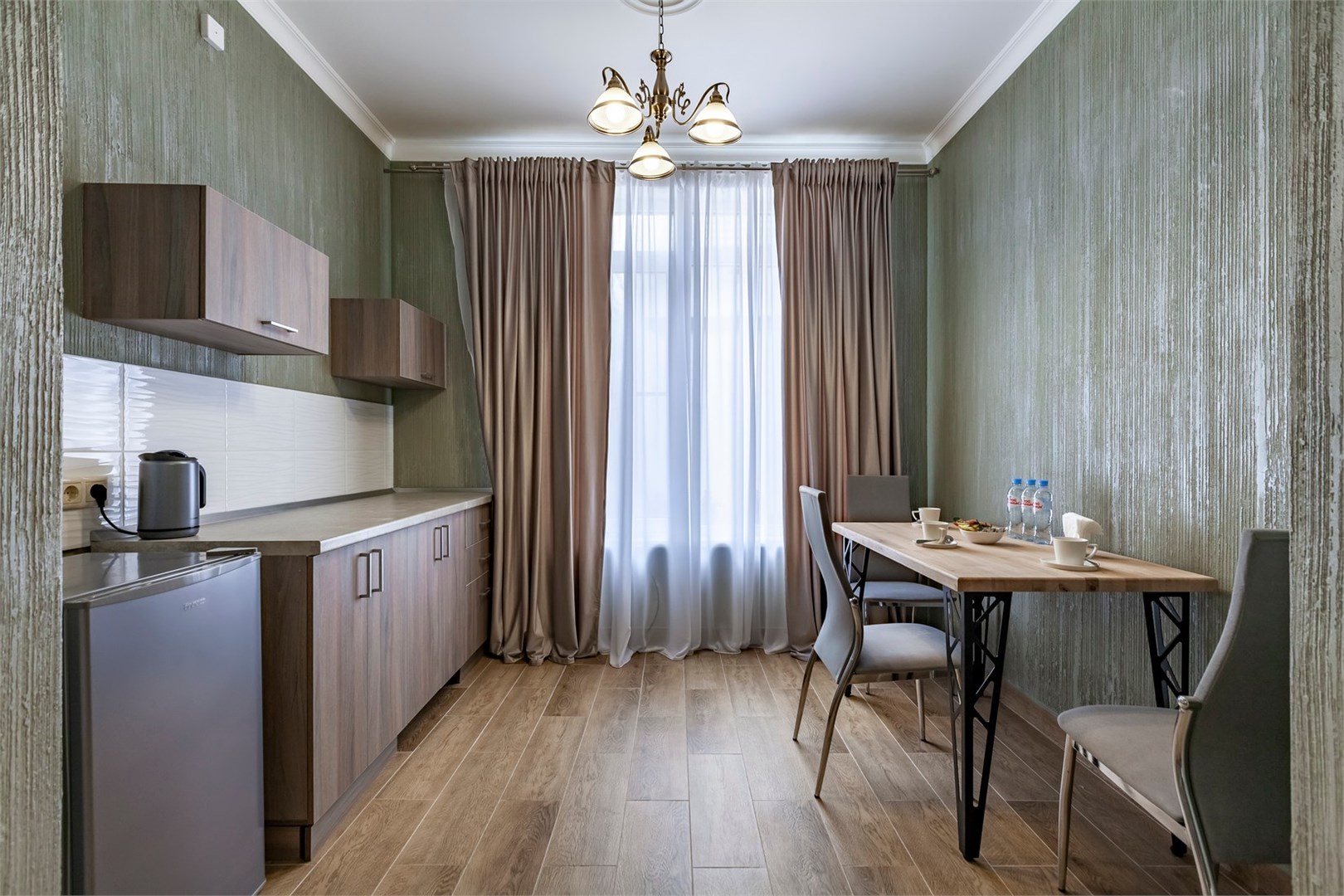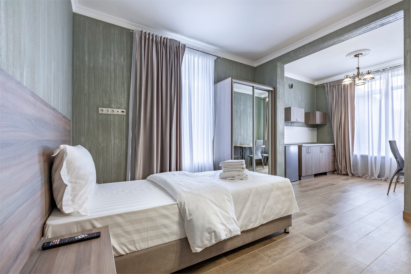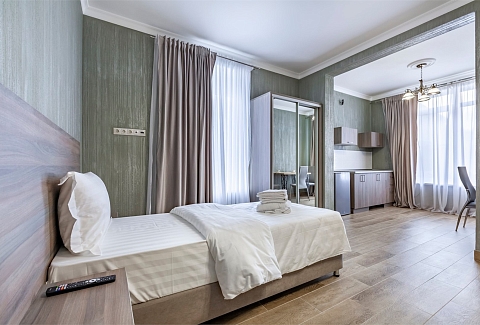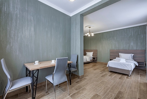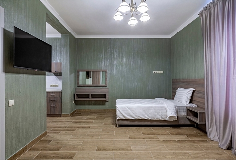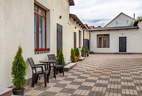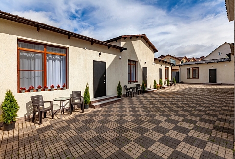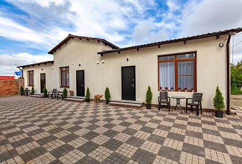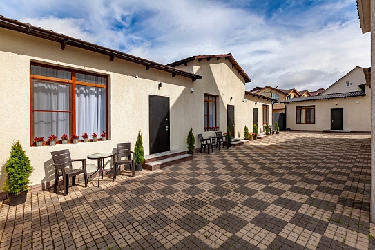 Отель размещен в одноэтажном корпусе. Номерной фонд представлен комфортабельными студиями до 4 гостей и апартаментами до 5 проживающих. Первая категория укомплектована односпальными кроватями, вторая — двуспальной кроватью, раскладными диваном и креслом. Во всех комнатах оснащена мини-кухня, есть отдельный выход во внутренний двор, собственная зона отдыха. На территории работает кафе. Оборудованы зона барбекю с мангалом и уютная беседка. Во дворе охраняемая гостевая парковка. Везде можно подключиться к Wi-Fi.