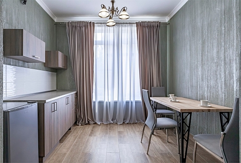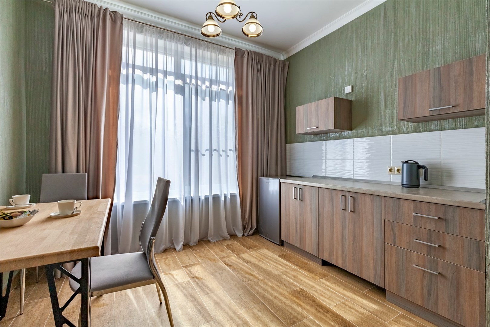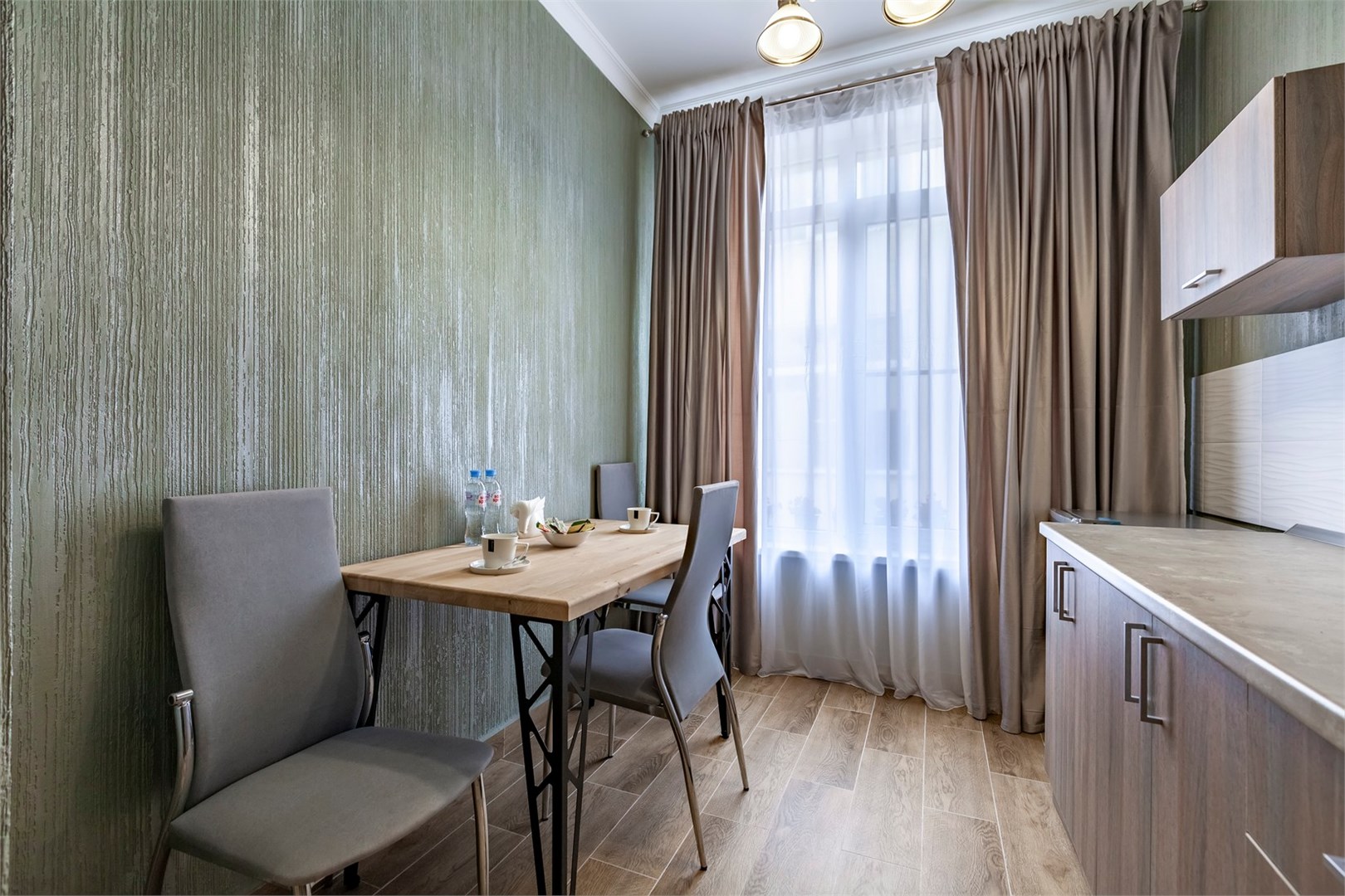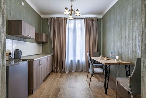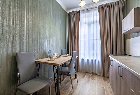 Отель размещен в одноэтажном корпусе. Номерной фонд представлен комфортабельными студиями до 4 гостей и апартаментами до 5 проживающих. Первая категория укомплектована односпальными кроватями, вторая — двуспальной кроватью, раскладными диваном и креслом. Во всех комнатах оснащена мини-кухня, есть отдельный выход во внутренний двор, собственная зона отдыха. На территории работает кафе. Оборудованы зона барбекю с мангалом и уютная беседка. Во дворе охраняемая гостевая парковка. Везде можно подключиться к Wi-Fi.