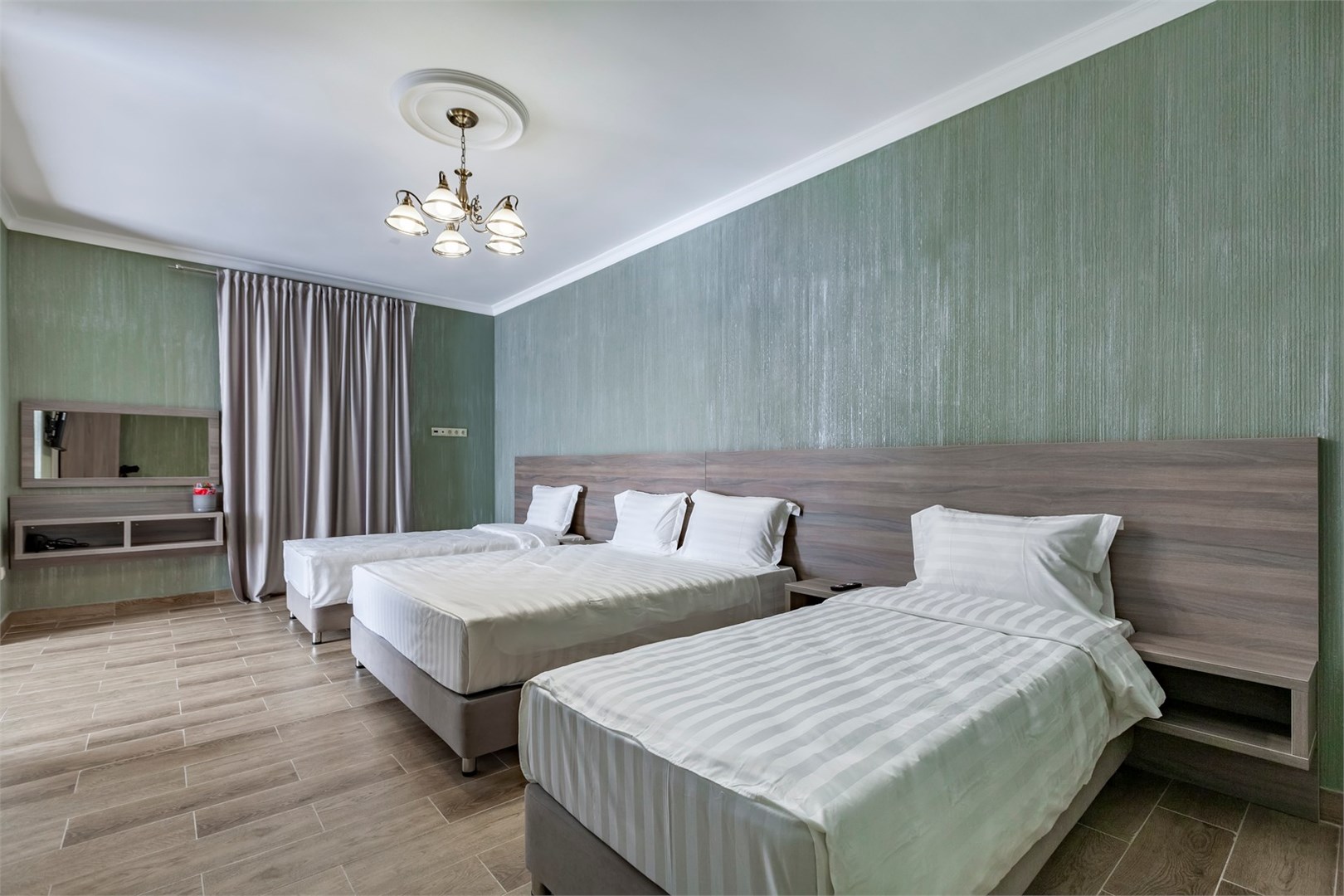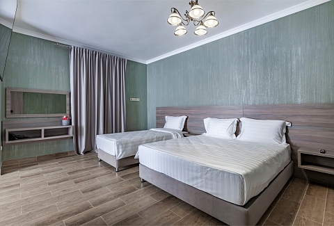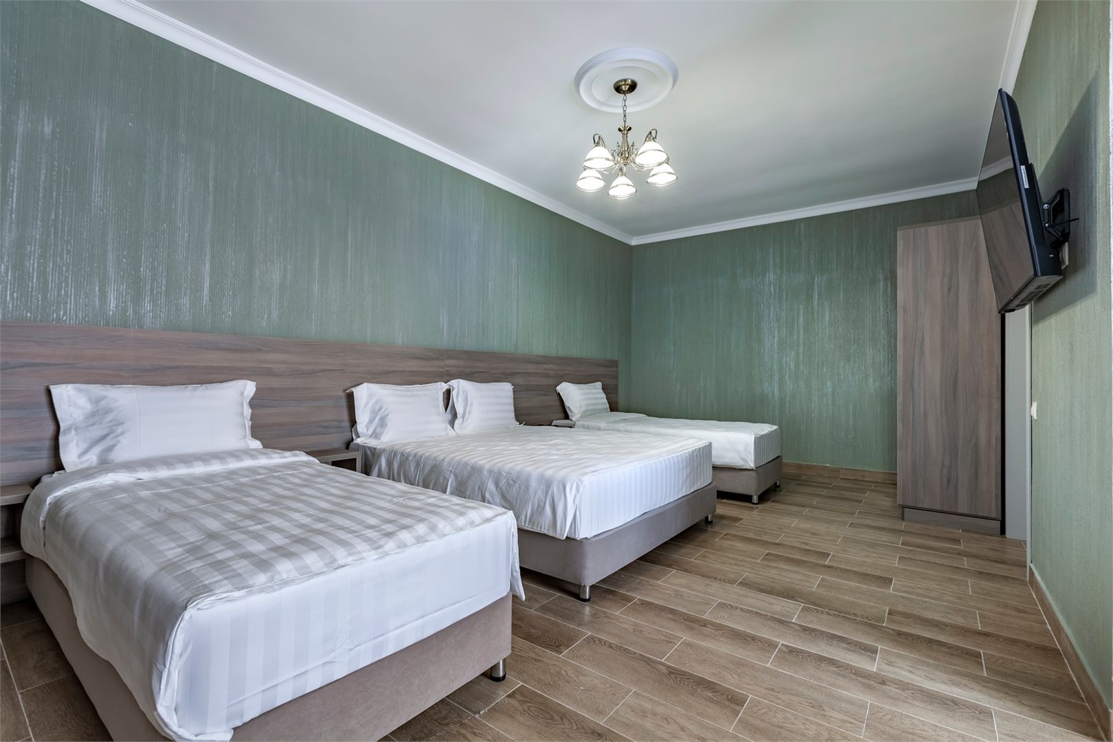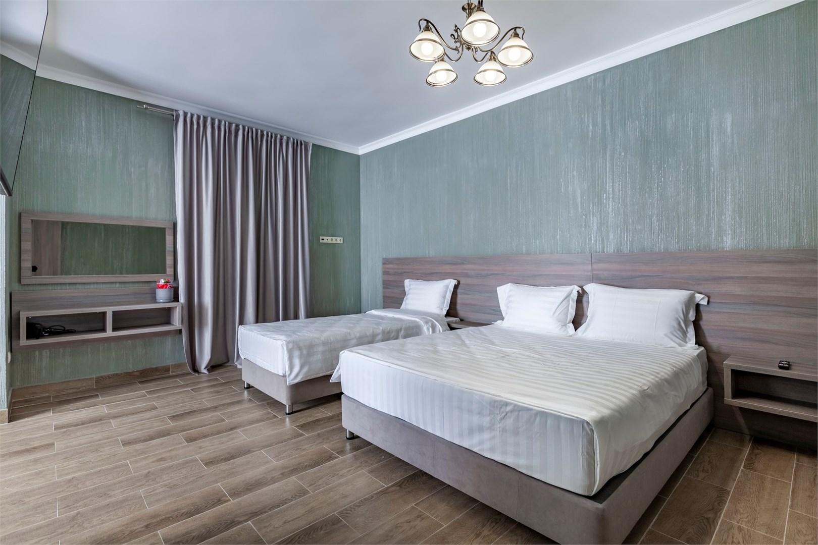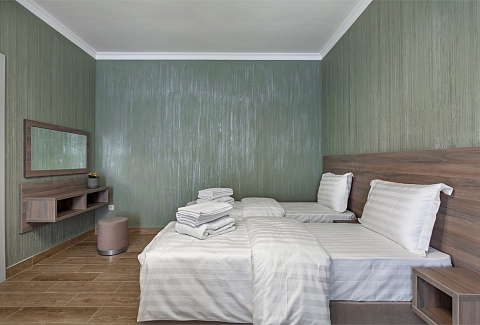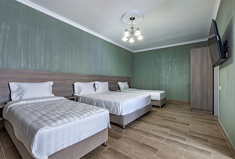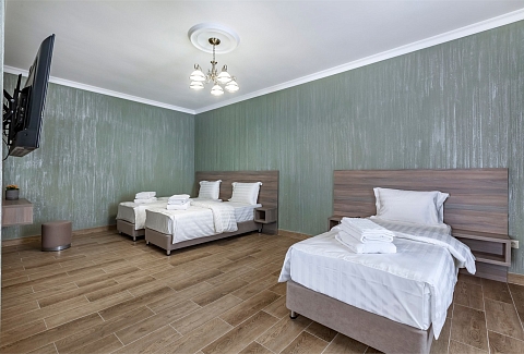 В номере: вешалка, зеркало, кровати односпальные, кровать двуспальная, стол, стулья, шкаф, кондиционер, мини-холодильник, набор посуды, телевизор ЖК, утюг, чайный набор посуды, электрочайник