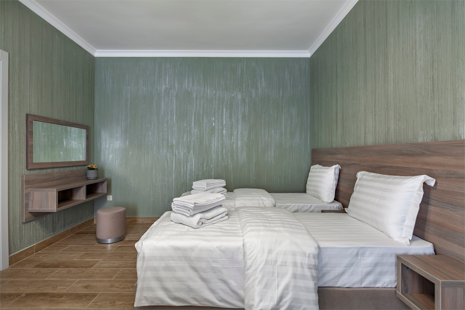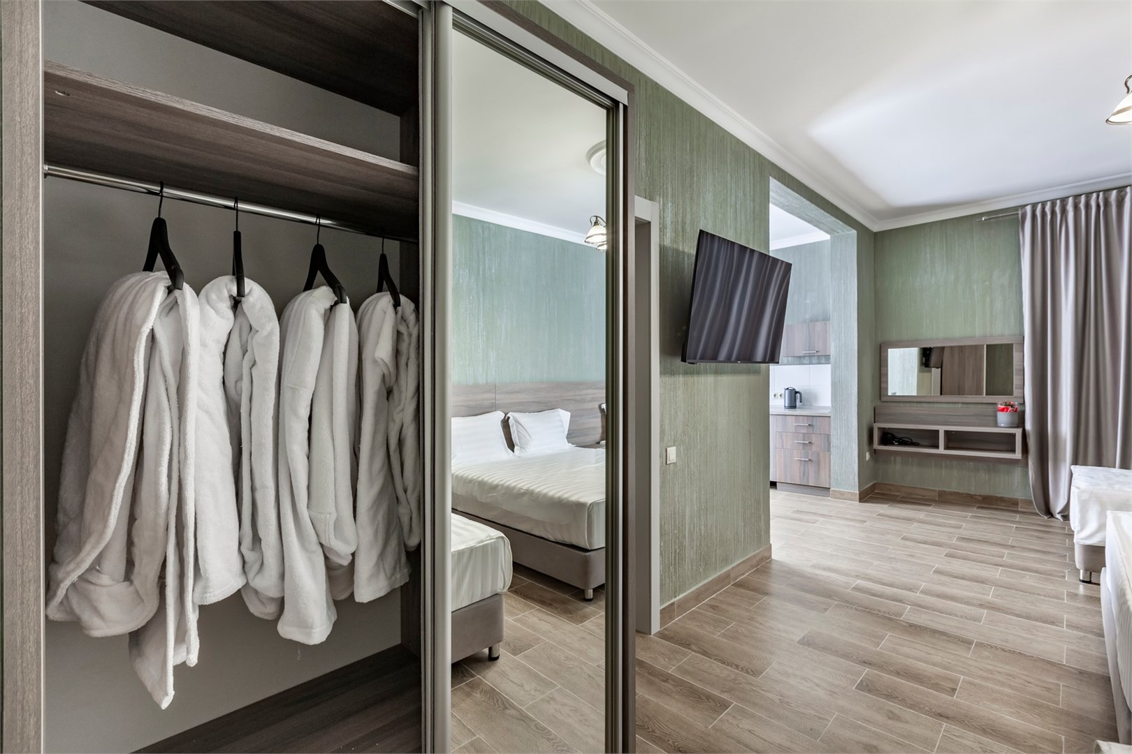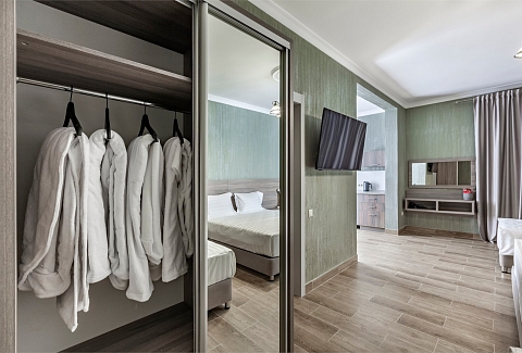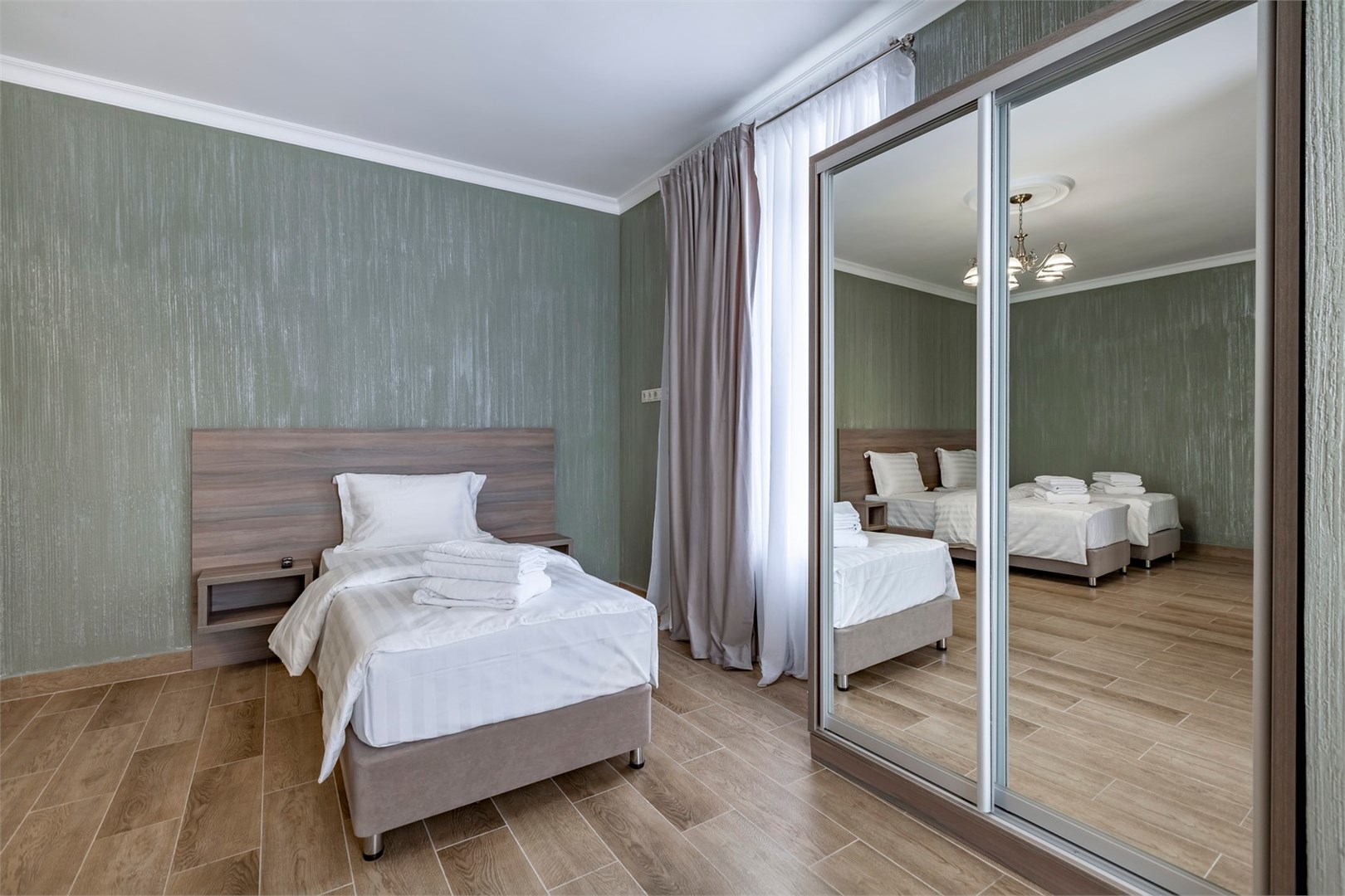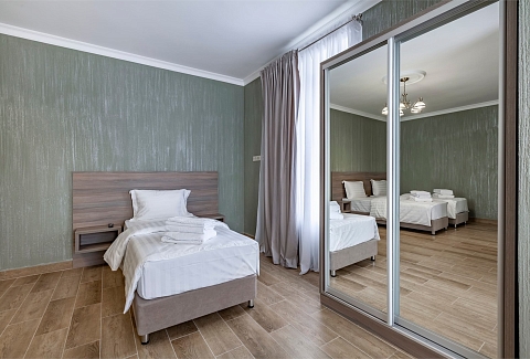 В номере: вешалка, зеркало, кровати односпальные, кровать двуспальная, стол, стулья, шкаф, кондиционер, мини-холодильник, набор посуды, телевизор ЖК, утюг, чайный набор посуды, электрочайник