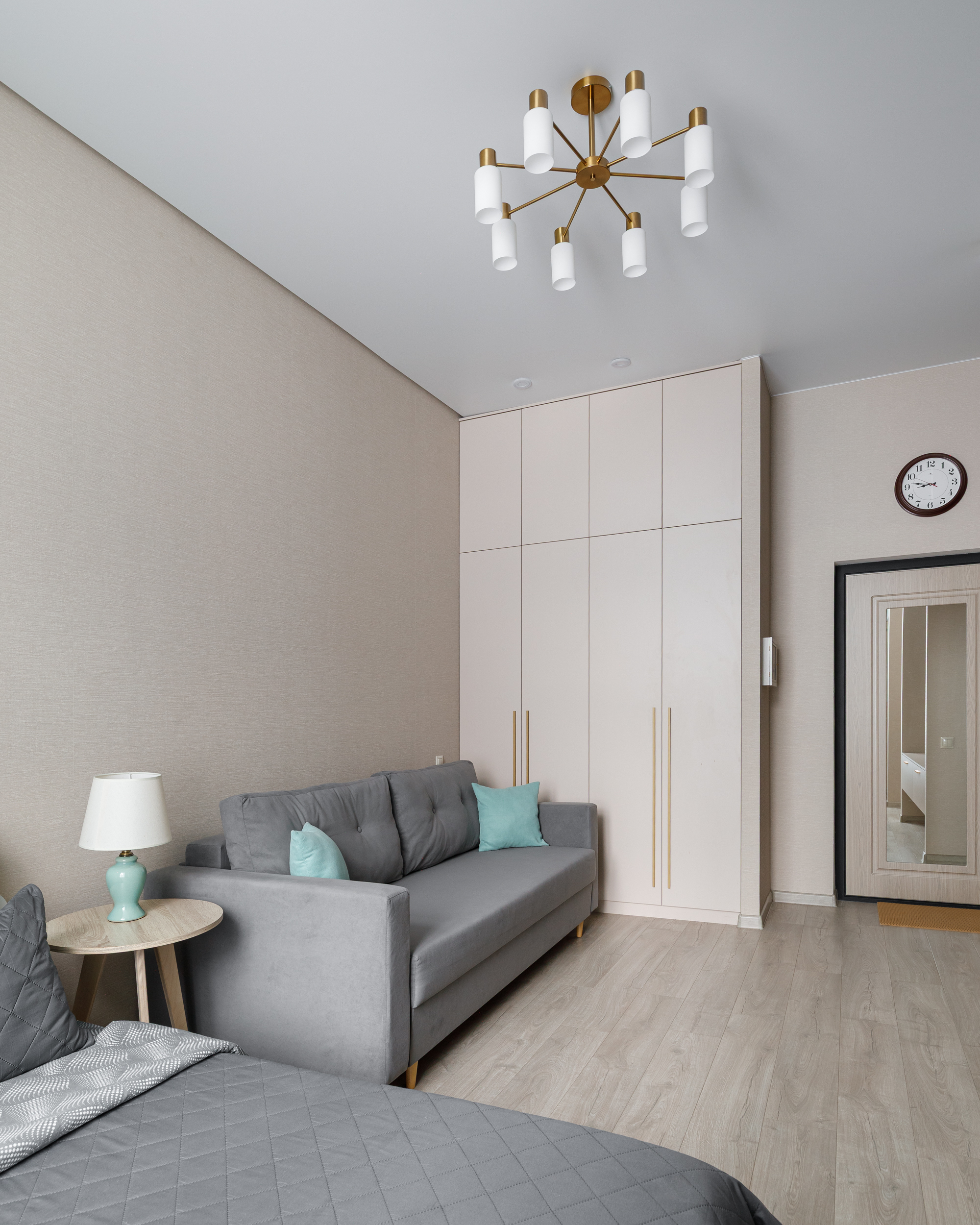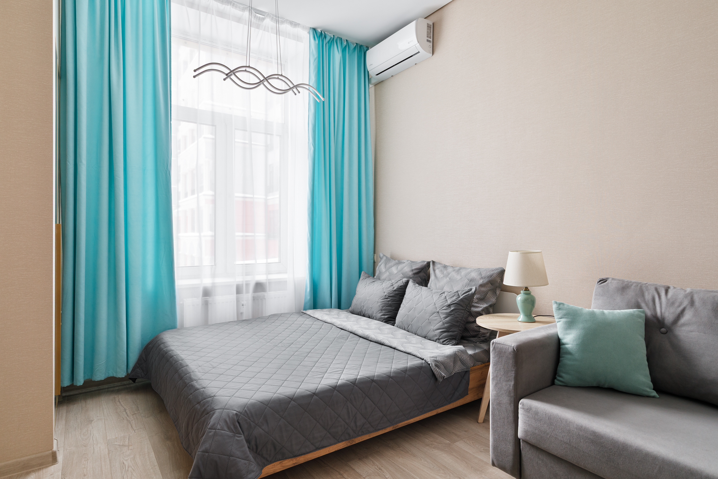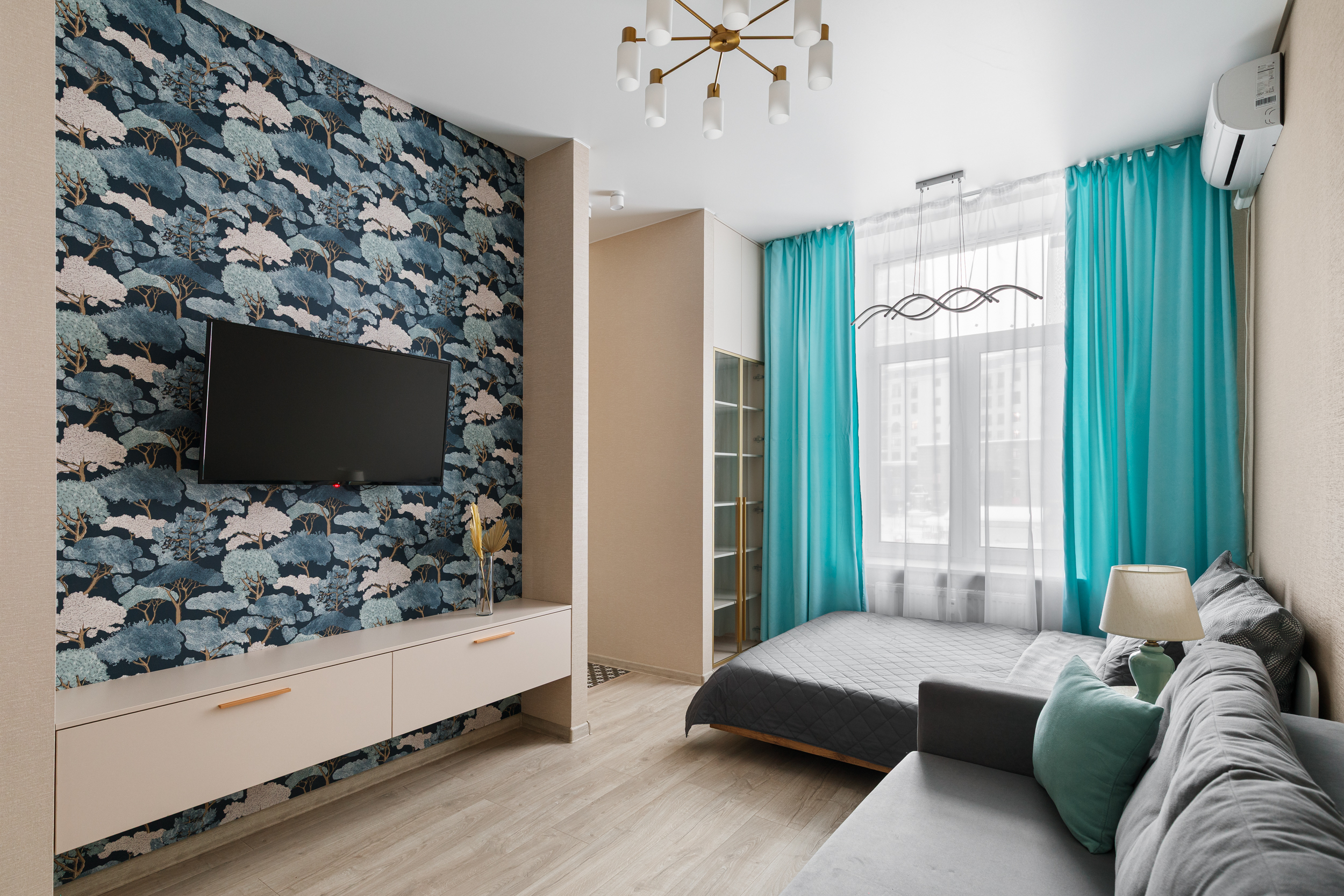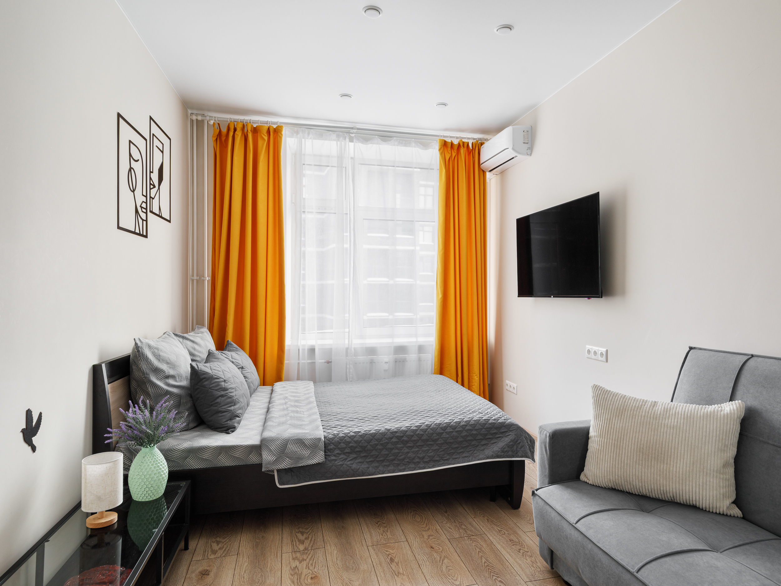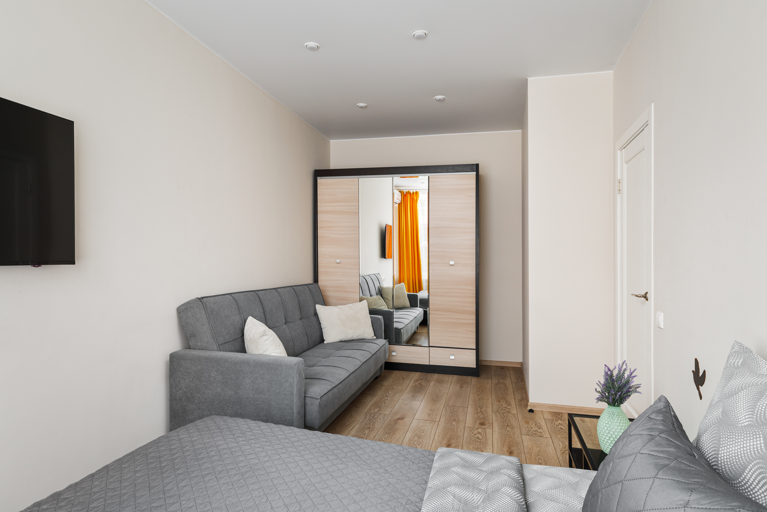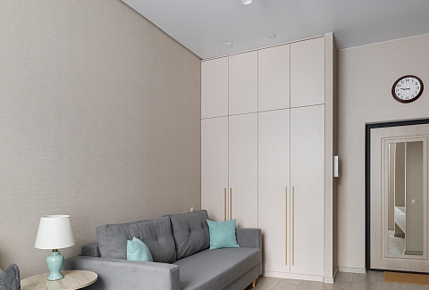 В номере: вешалка, диван, зеркало, кровать двуспальная, стол, стулья, шкаф, кондиционер, микроволновая печь, стиральная машина, телевизор, утюг, холодильник