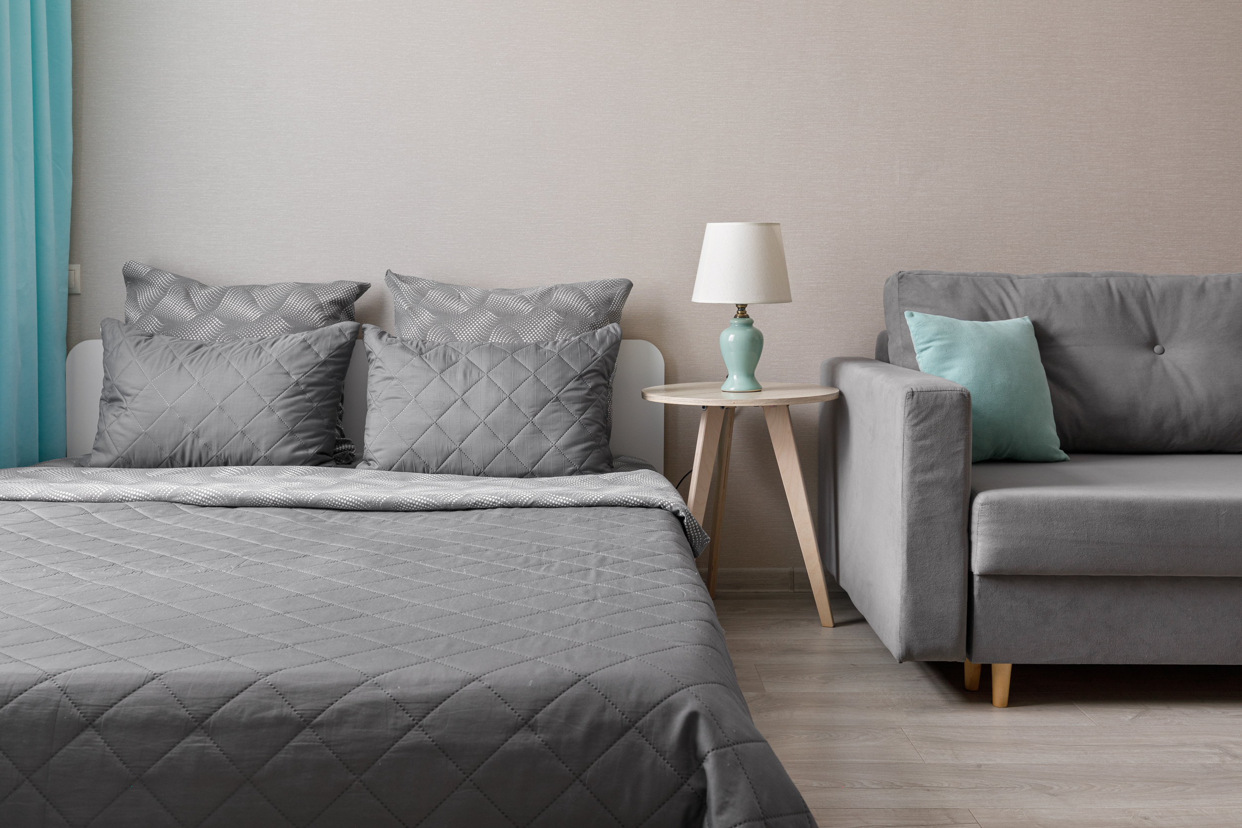 В номере: вешалка, диван, зеркало, кровать двуспальная, прикроватные тумбочки, стол, стулья, шкаф, микроволновая печь, набор посуды, плита, стиральная машина, телевизор, утюг, холодильник, электрочайник