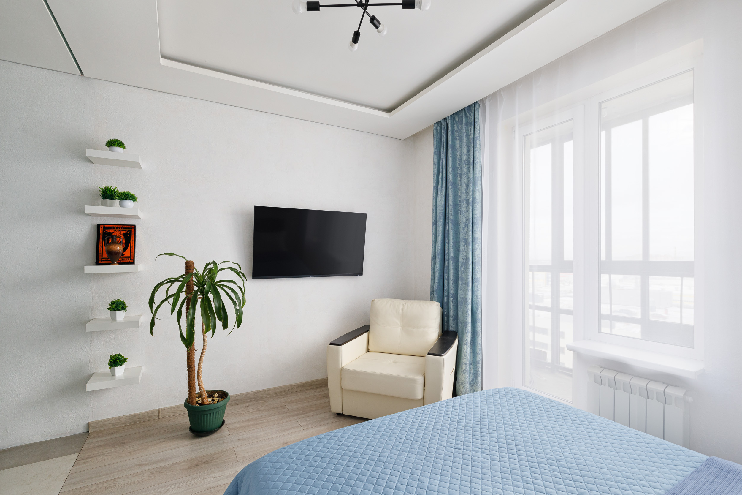 В номере: диван, зеркало, кровать двуспальная, стол, стулья, шкаф, микроволновая печь, мини-холодильник, плита электрическая, стиральная машина, телевизор, утюг, холодильник, чайный набор посуды, электрочайник