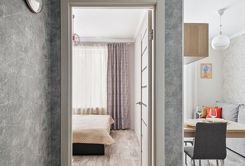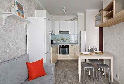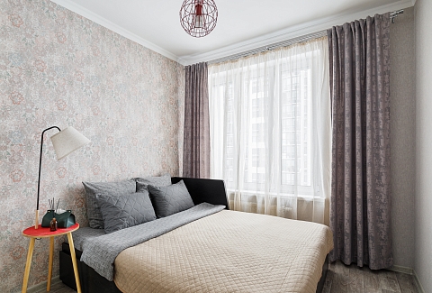 Эти апартаменты с современным дизайнерским ремонтом расположены в жилом комплексе «Две столицы», что в Химках. Тихий и ухоженный район находится в непосредственной близости от аэропорта Шереметьево и торгово-развлекательного комплекса «Мега Химки». В самом здании на первых этажах работают продуктовые магазины, фитнес-клуб, салон красоты и пункты выдачи заказов, а во дворе обустроена детская игровая площадка.